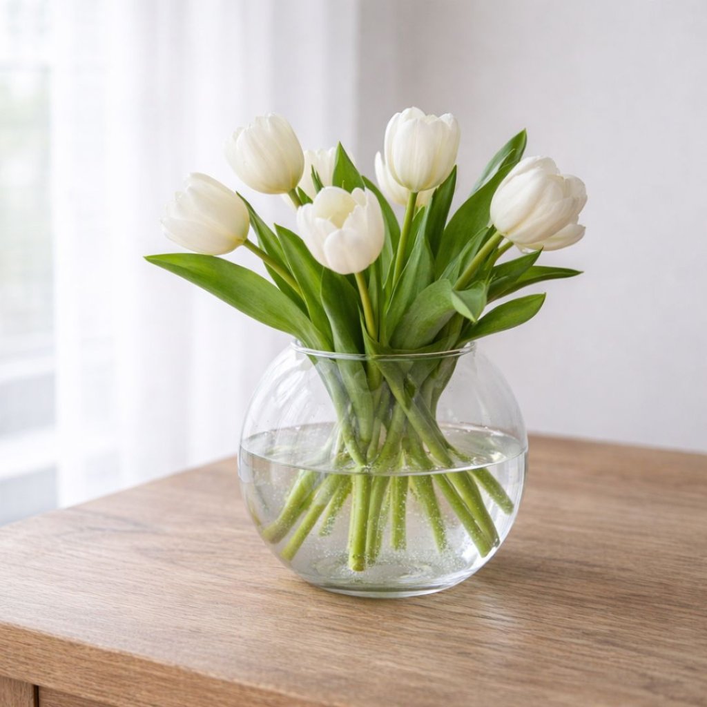 Kulatá čirá váza působí lehce a nadčasově – jako tichý základ pro květiny, větvičky nebo plamen svíčky.