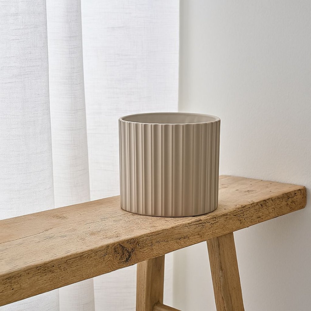 - Tento květináč je navržen v moderním minimalistickém stylu s jemným žebrováním po celém povrchu, které přidává vizuální texturu a eleganci.
