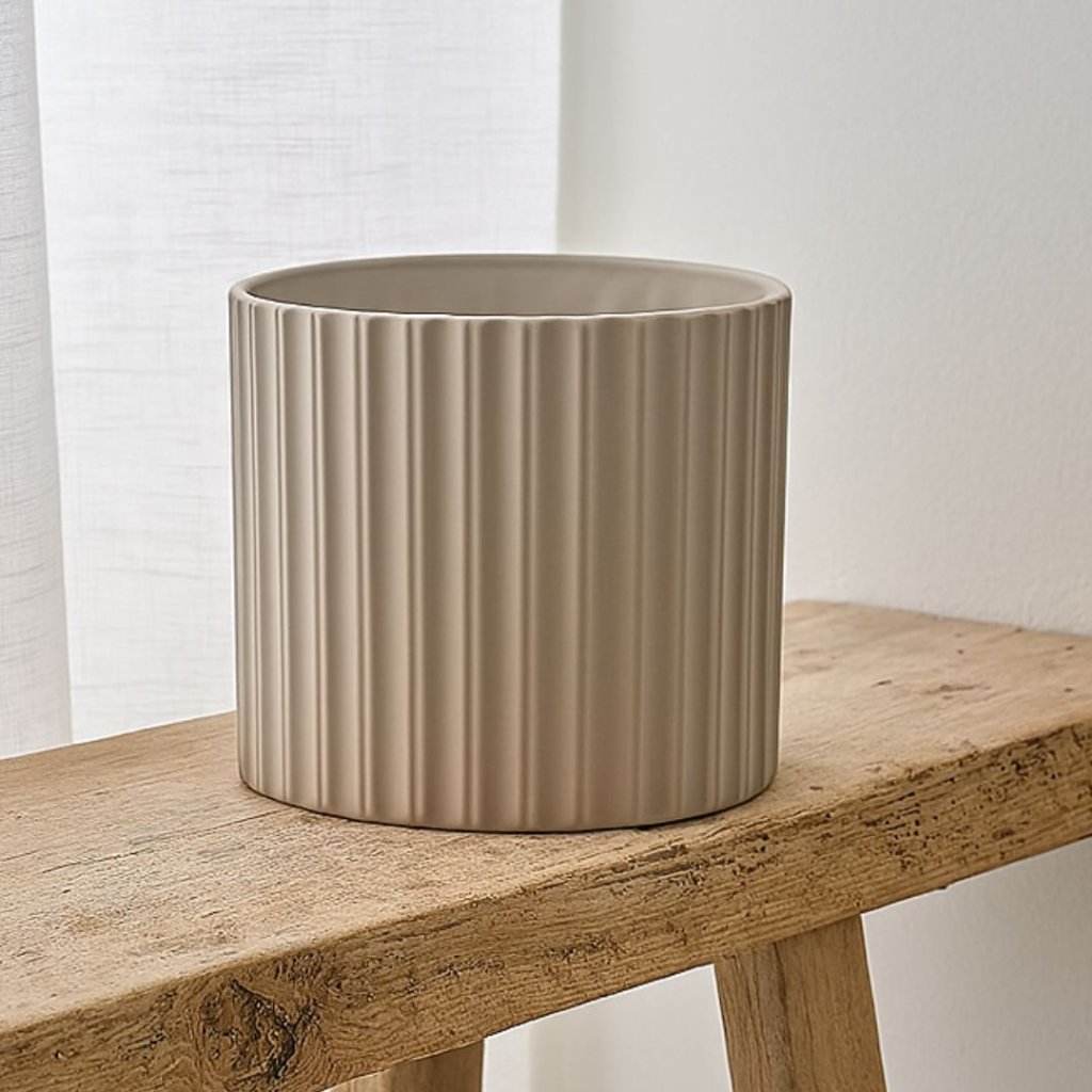 - Tento květináč je navržen v moderním minimalistickém stylu s jemným žebrováním po celém povrchu, které přidává vizuální texturu a eleganci.