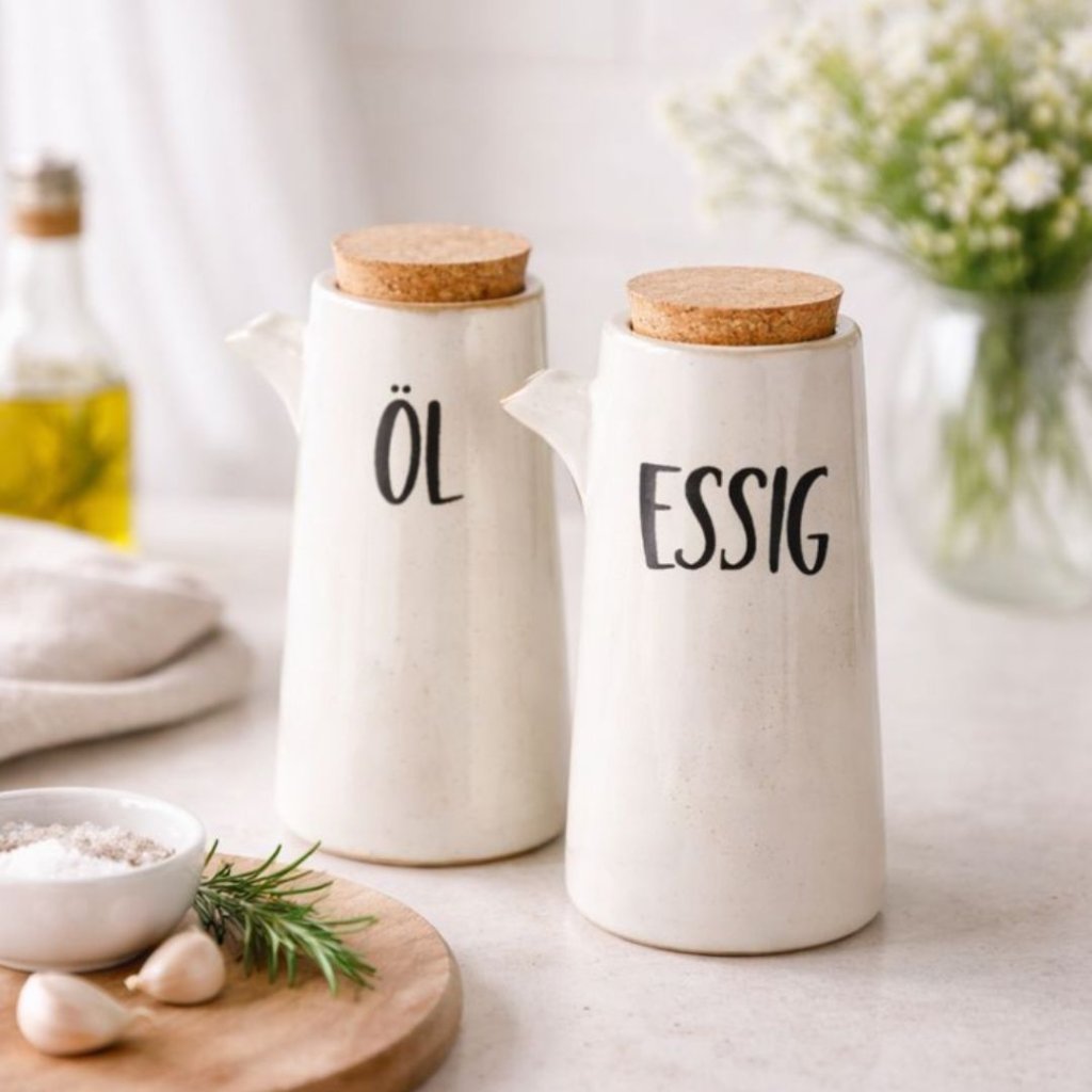 - Skvěle se hodí na kuchyňskou linku, jídelní stůl i venkovní stolování – budete mít olej i ocet vždy po ruce a zároveň hezky naservírované. Malý detail, který dělá vaření i stolování příjemnější.