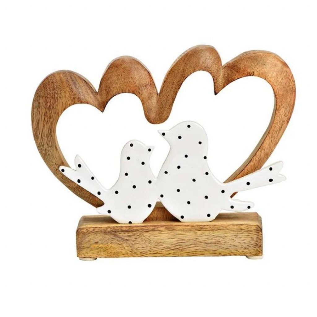 Dekorace na postavení v podobě dřevěného srdce z manga a ptáčků v bílo černé barvě na dřevěném podstavci z mangového dřeva bude dělat velkou parádu na parapetě nebo komodě při příchodu jara.
