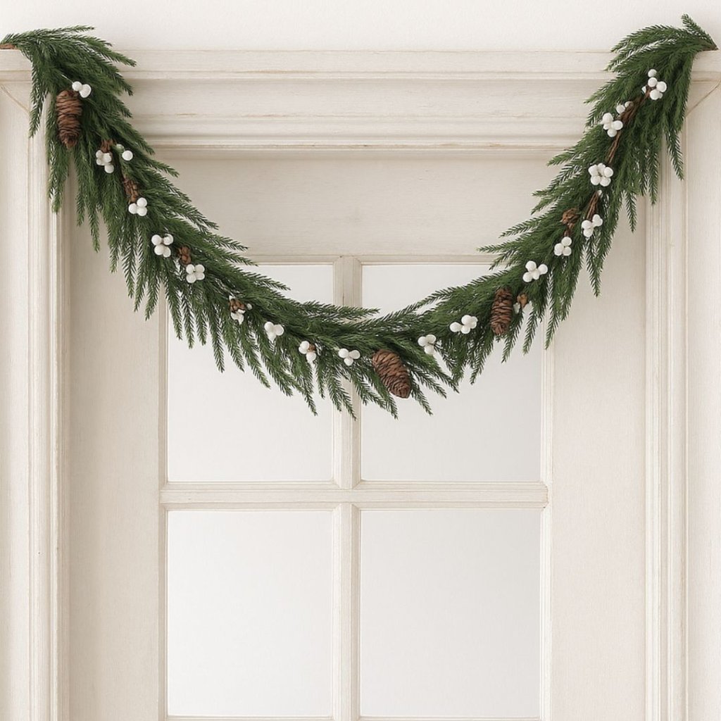 - Vneste do svého domova kouzlo zimní přírody. 🌲❄️ Tato elegantní girlanda s přirozeným vzhledem zeleného jehličí, šišek a jemných bílých akcentů je dokonalým doplňkem pro sváteční výzdobu.