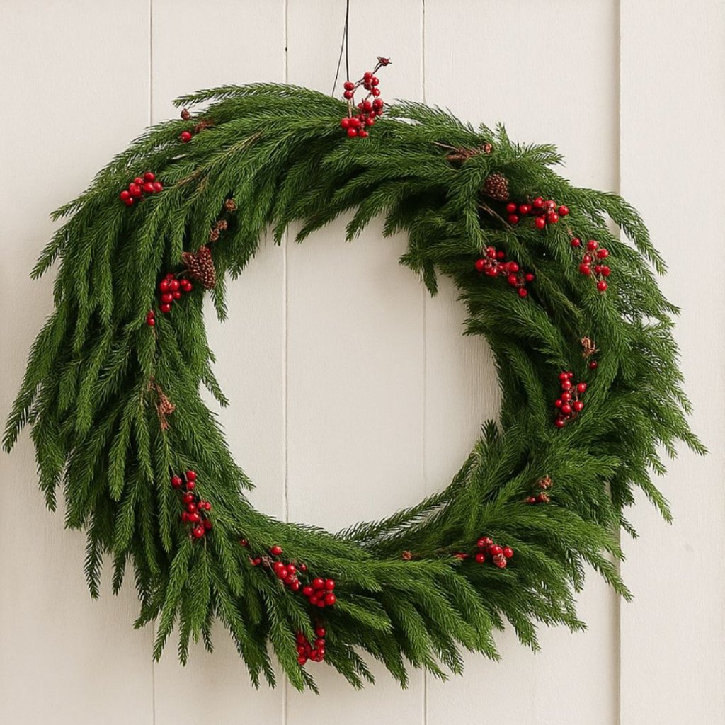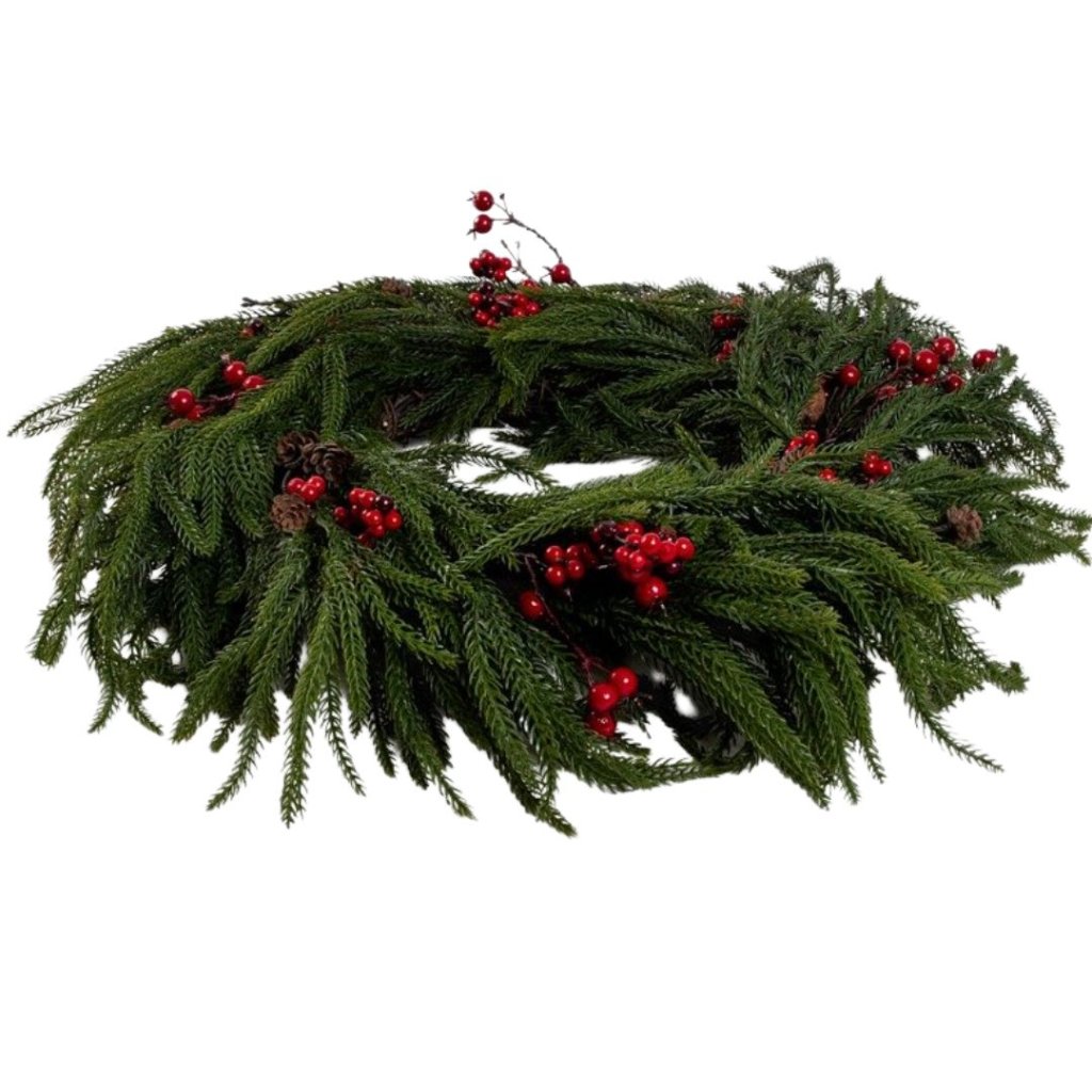 - Vneste do svého domova kouzlo zimní přírody. 🌲❄️ Tento věnec s přirozeným vzhledem zeleného jehličí, šišek a jemných červených akcentů je dokonalým doplňkem pro sváteční výzdobu.