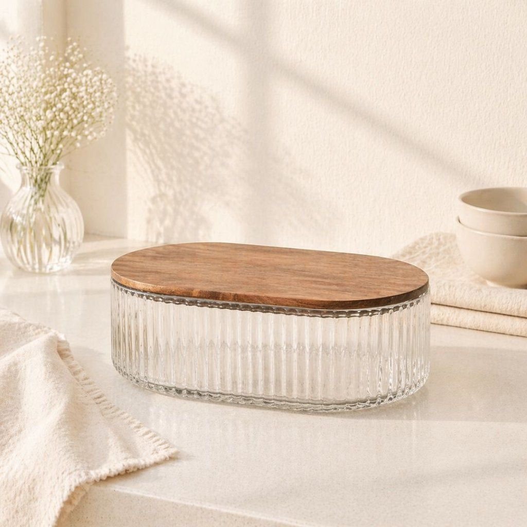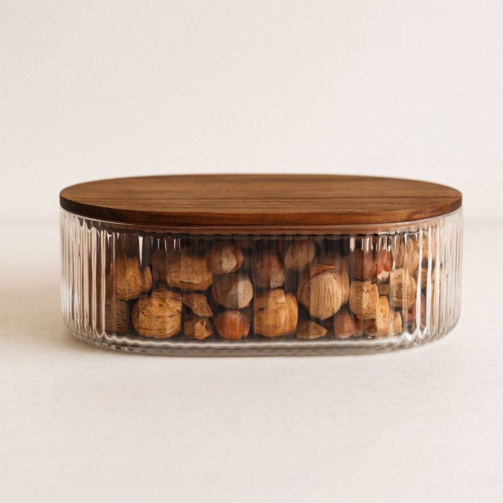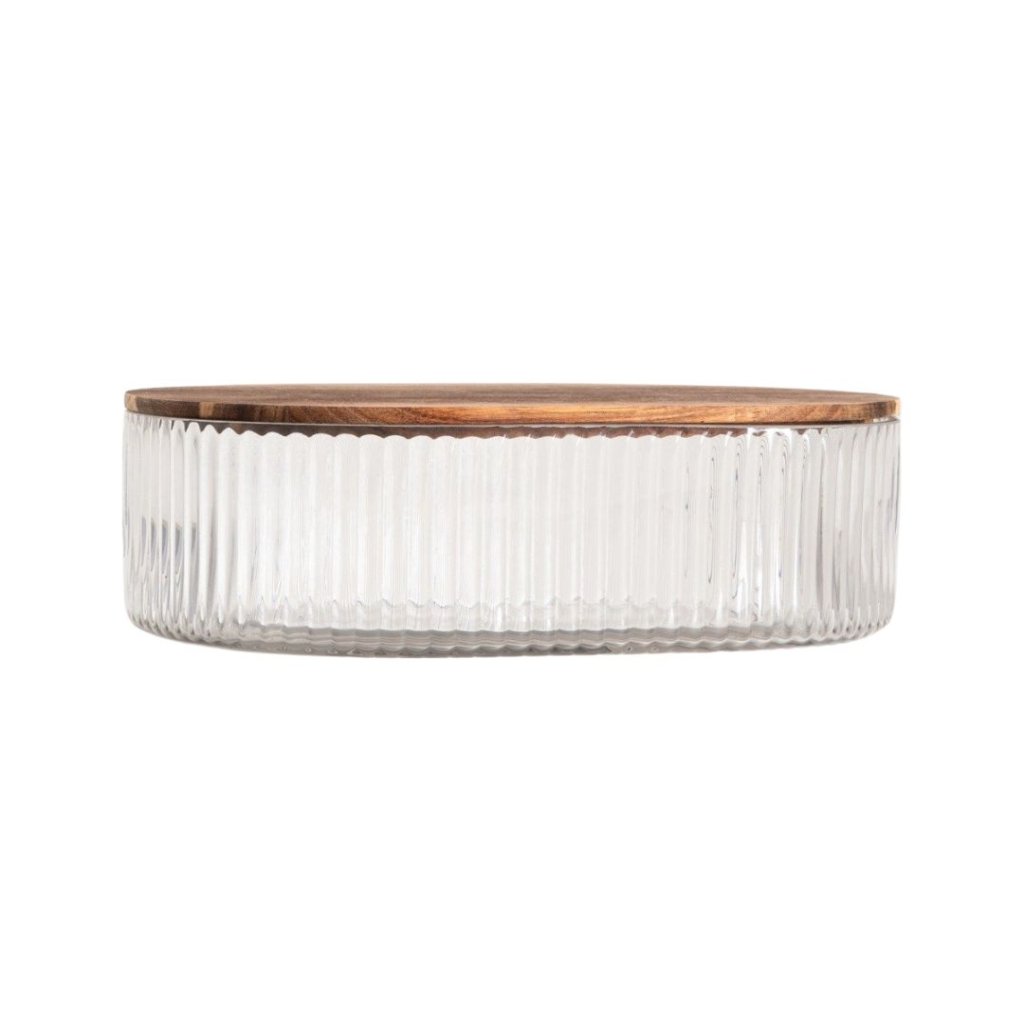 - Stylová nádoba z pevného skla s jemným rýhováním, která spojuje praktičnost s nadčasovým designem. Průhledné sklo umožňuje přehled o obsahu a akáciové víko dodává teplý přírodní akcent. Ideální pro uchování sušenek, ořechů, ovoce či koření, ale i pro organizaci drobných doplňků. Skvěle se hodí do každé kuchyně, kde se stane nejen pomocníkem, ale i elegantní dekorací.