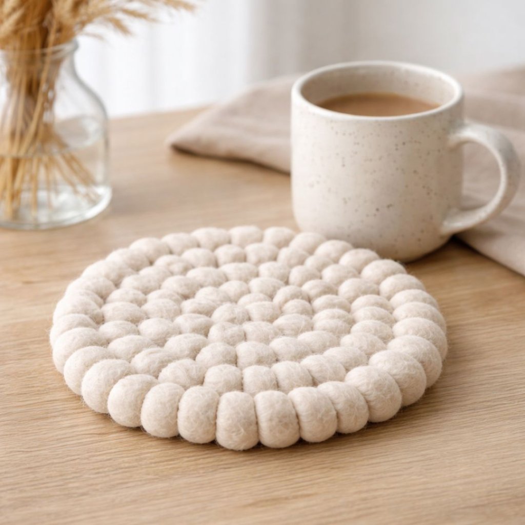 - Podložky jsou tvořeny z jemných vlněných kuliček v přírodním světlém odstínu, díky čemuž perfektně zapadnou do skandinávského, přírodního i moderního interiéru.