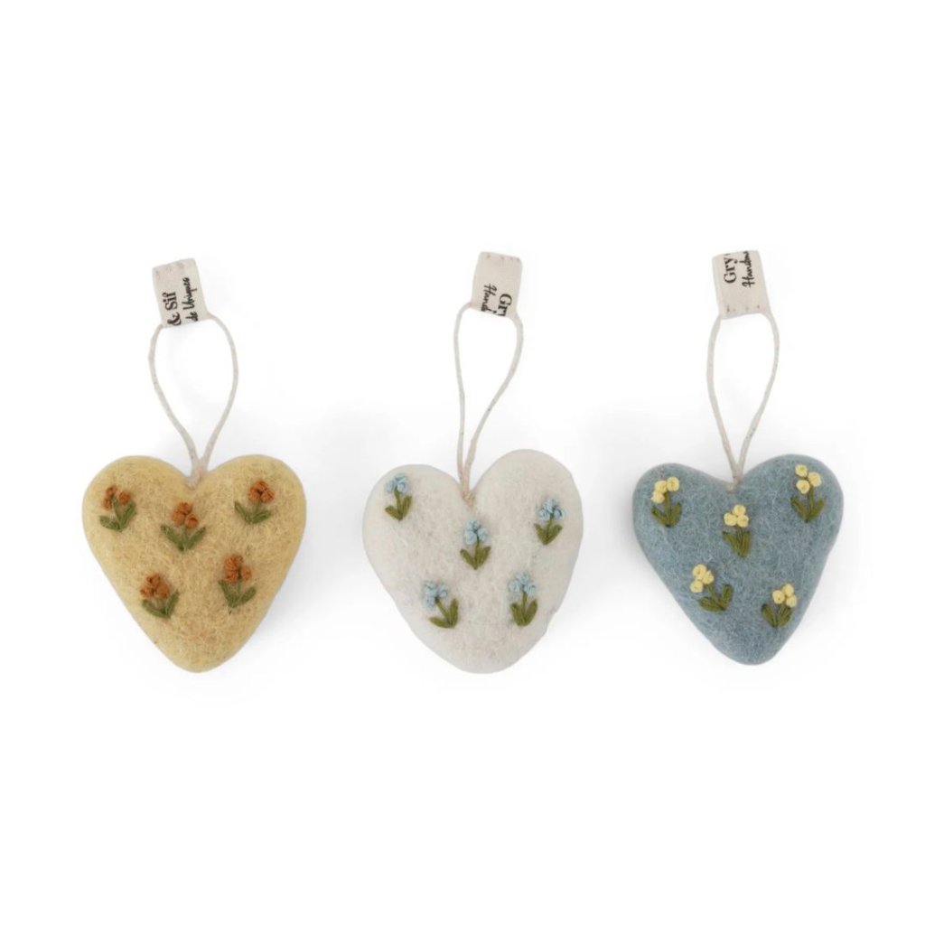- Každé srdce je pečlivě tvarované z ovčí vlny a zdobené drobnými vyšívanými kvítky, které mu dodávají romantický a přírodní vzhled.