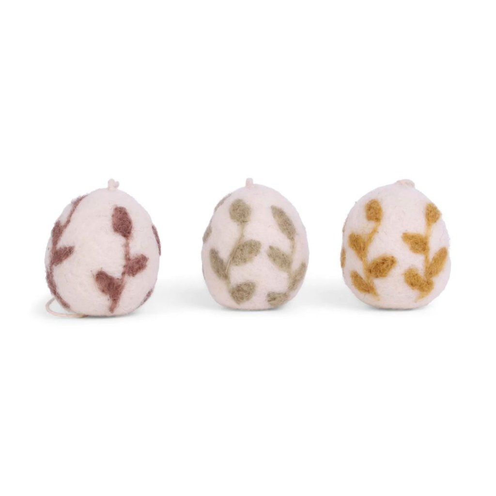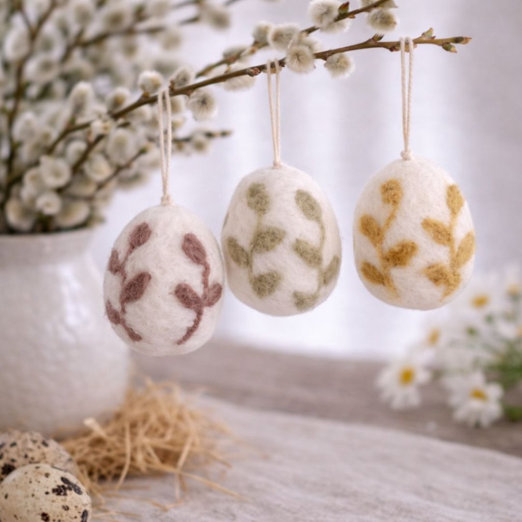 - Každé vajíčko je vytvořeno z ovčí vlny a zdobené drobným lístkovým vzorem v přírodních tónech – hnědé, zelené a medové.