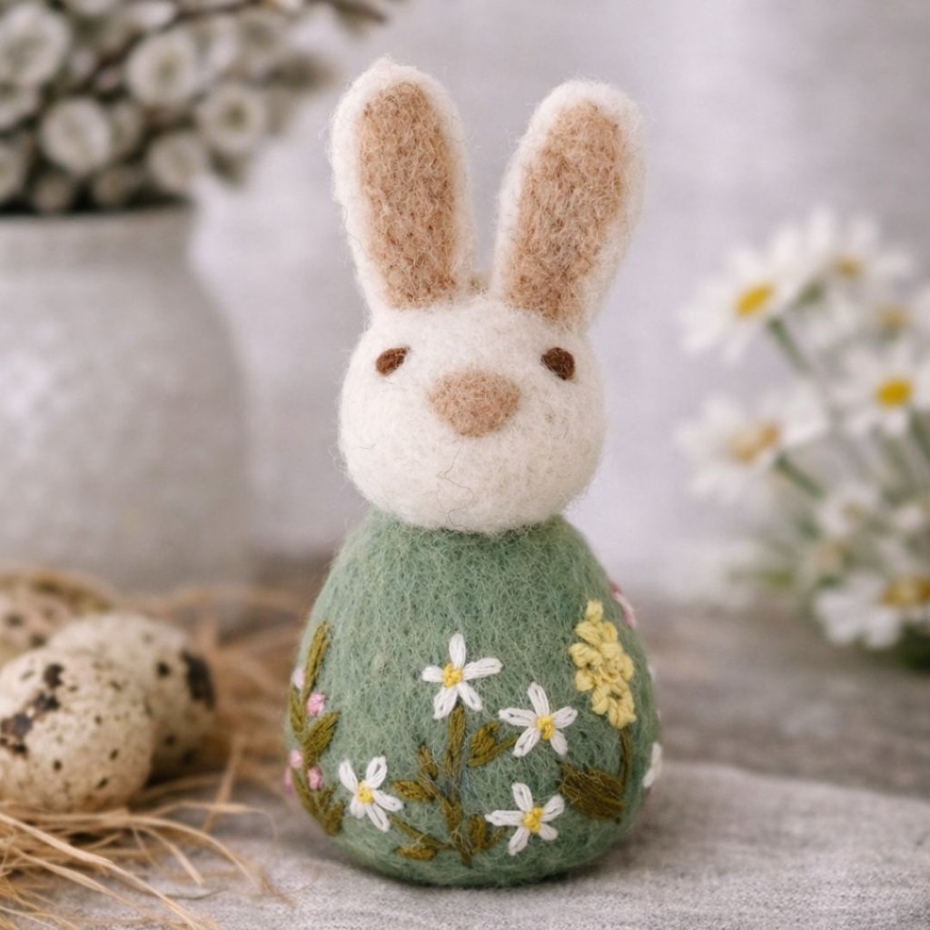 - Každý kus je ručně vyráběný z přírodní ovčí vlny a zdobený detailní květinovou výšivkou, která dává zajíčkovi jedinečný charakter.