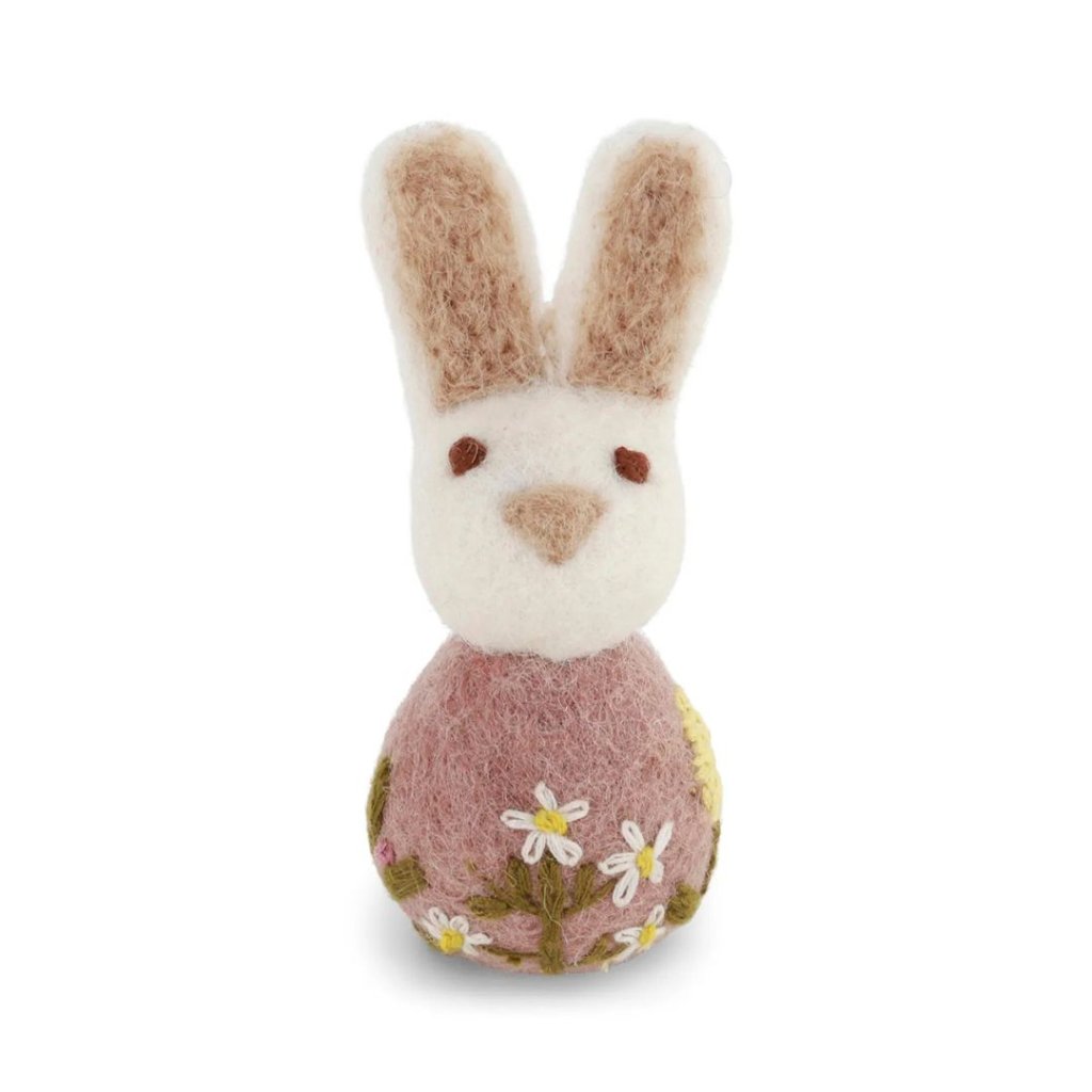 - Zajíček je ručně vyrobený z jemné ovčí vlny a zdobený drobnými vyšívanými kvítky v přírodních tónech.