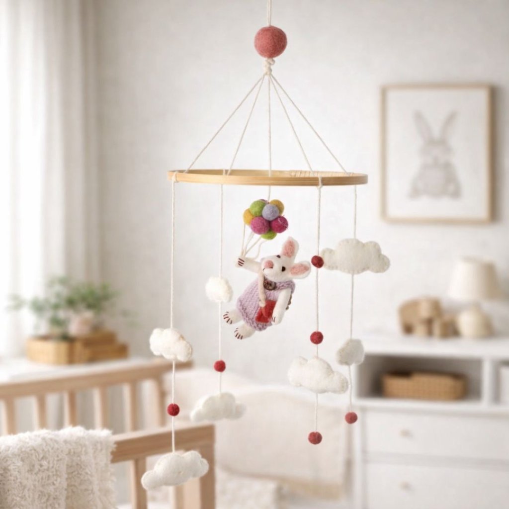 - Jemný kolotoč z ovčí vlny vypráví tichý příběh o klidu, bezpečí a dětských snech.
