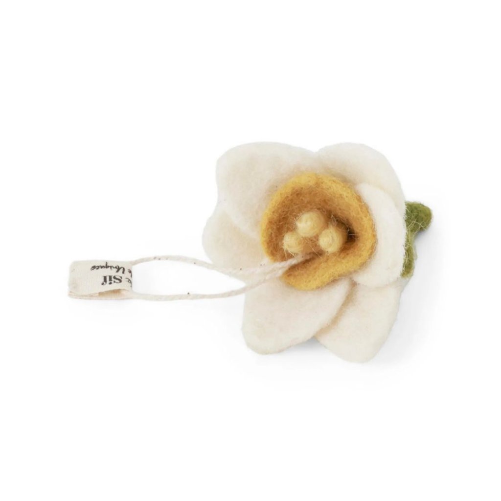 - Květ je pečlivě tvarovaný z ovčí vlny, s důrazem na každý detail – od hebkých bílých okvětních lístků až po výrazný žlutý střed.