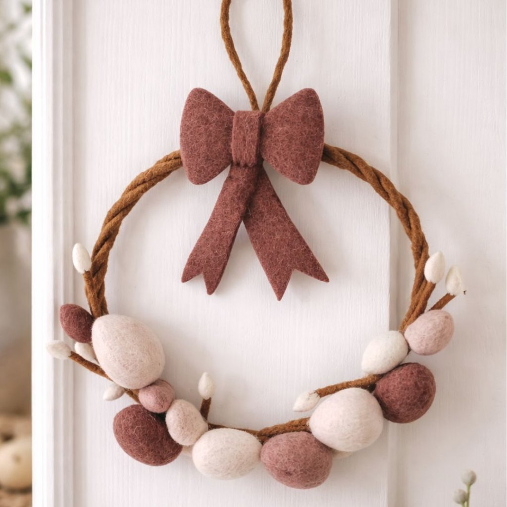 - Základ tvoří pevný plstěný kruh v přírodním hnědém odstínu, ozdobený drobnými vajíčky v jemných pudrových tónech a doplněný elegantní mašlí, která dodává věnci slavnostní a romantický vzhled.