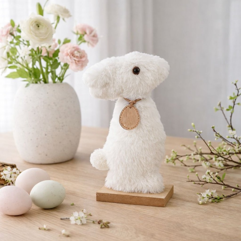 Hebký králík v čisté bílé barvě přinese do interiéru jemnost a klidnou velikonoční atmosféru.