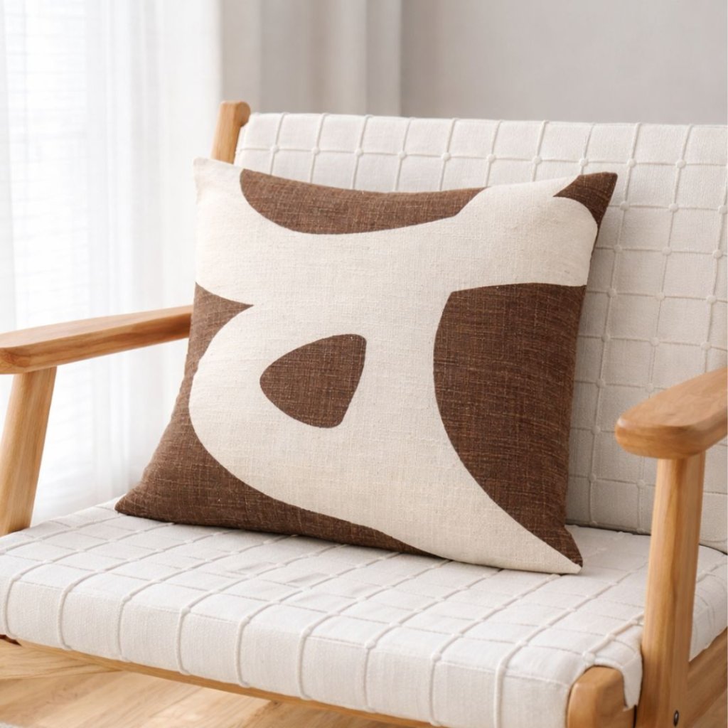 Kontrast hnědé bavlny a bílých křivek mu ale dává tichou sílu, která v prostoru zůstává.