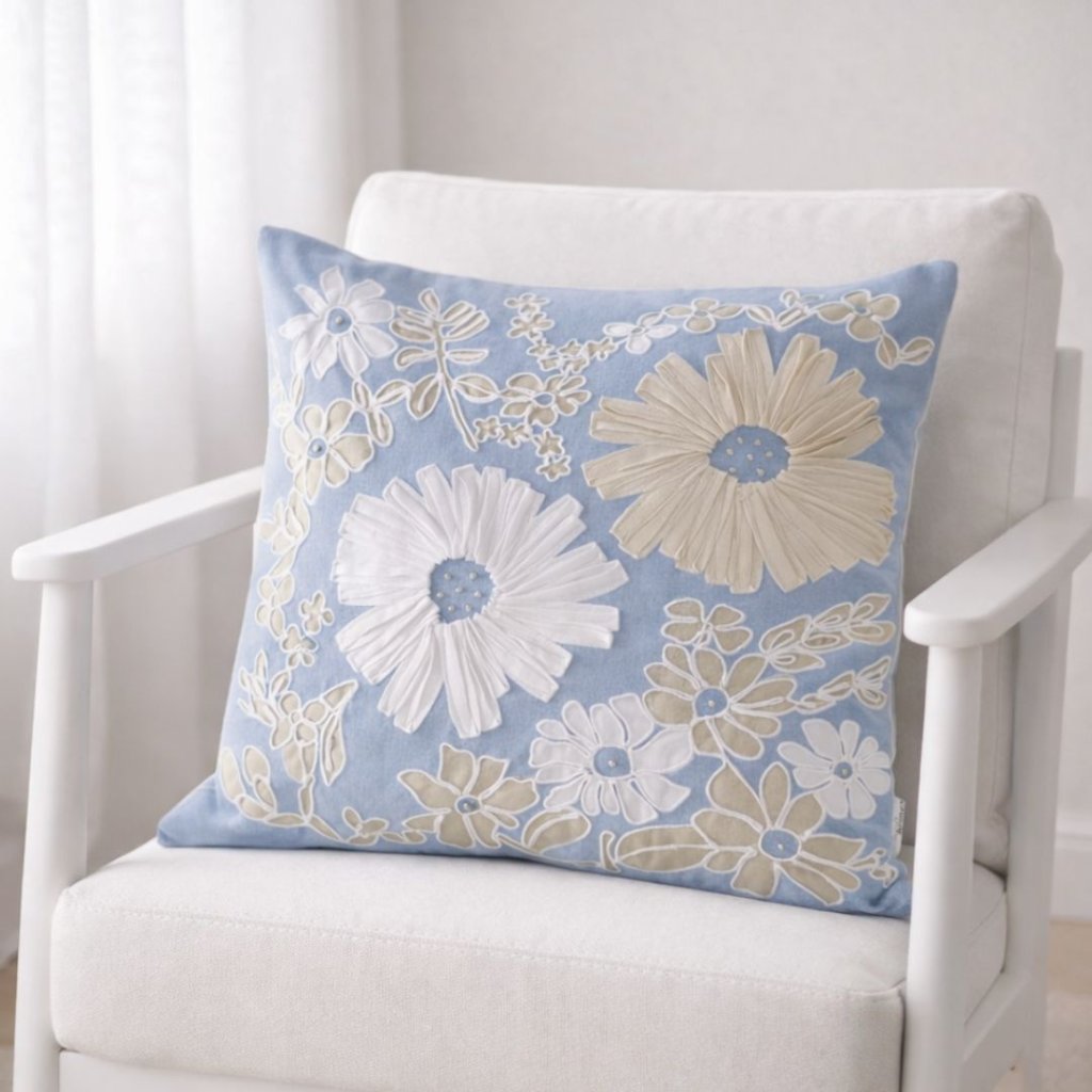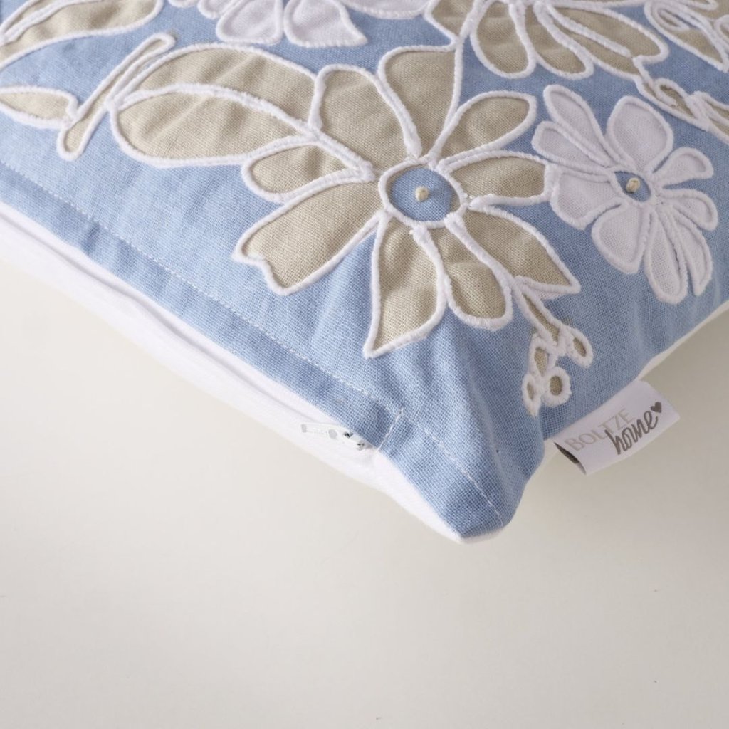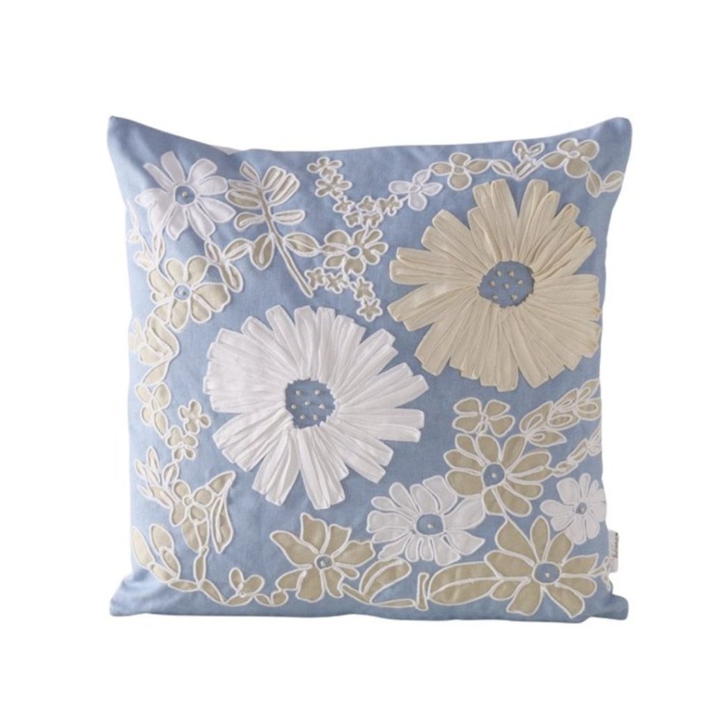 - Polštář Beate v jemném modrém tónu přináší do interiéru klid, lehkost a nádech přírody inspirovaný letní loukou.