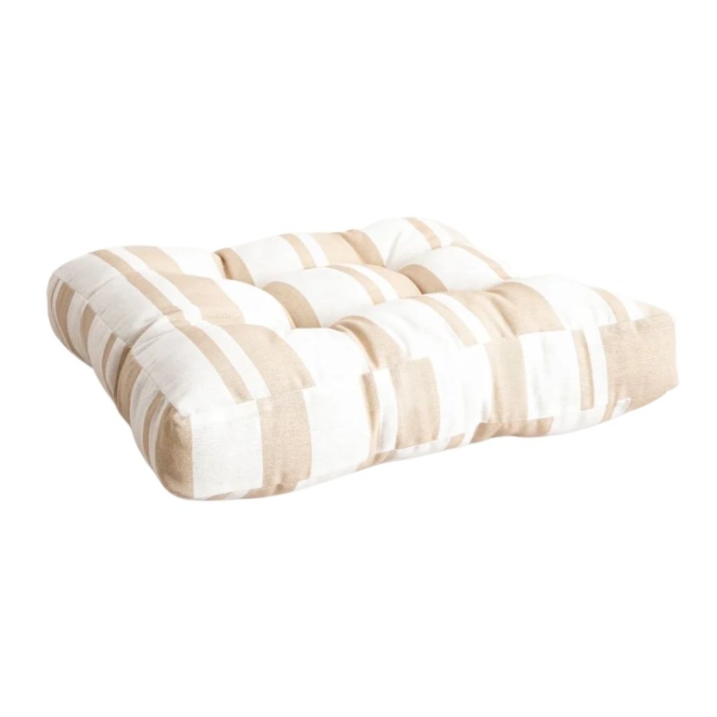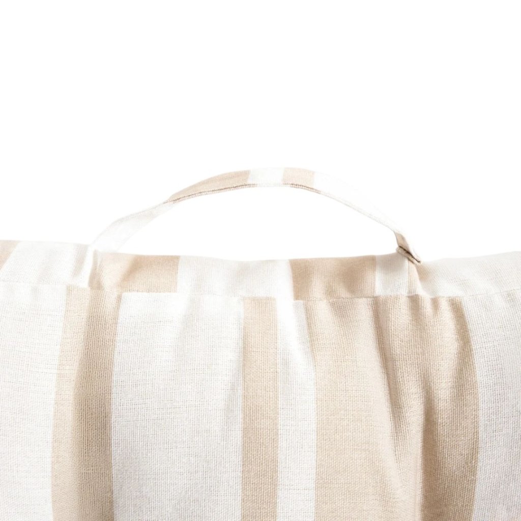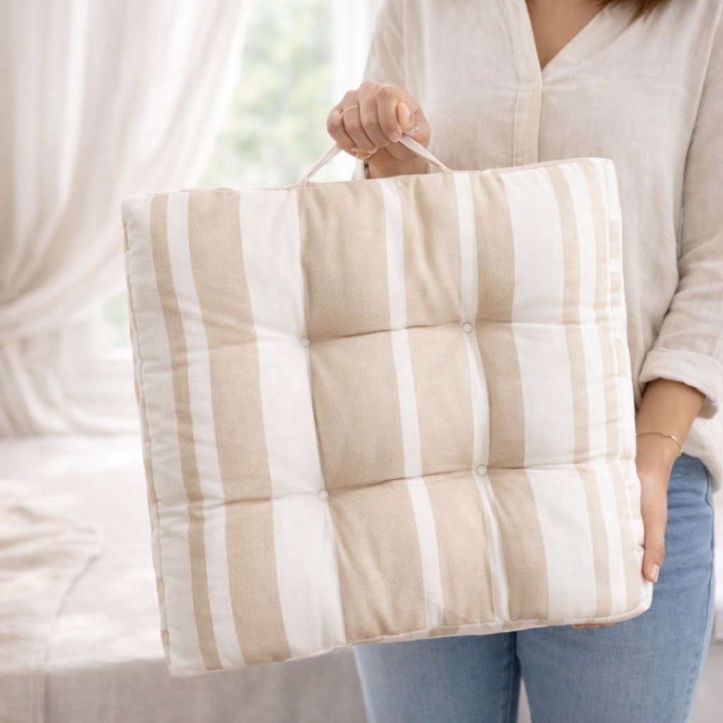 - Béžové pruhy v přírodní kombinaci působí nadčasově a lehce, zatímco decentní prošívání dodává polštáři strukturu a měkkost. Praktické ucho usnadní přenášení z lavičky na terasu nebo z kuchyně do obývacího koutku.