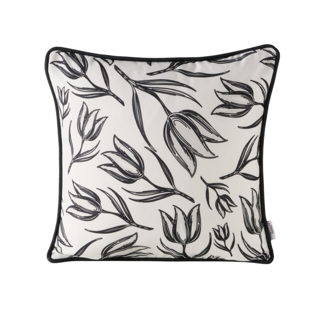 - Moderní polštář s tulipány a lemmováním, který okamžitě přitáhne pozornost a dodá interiéru výraz i charakter ( ve stejném designu máme vázu a svícen )