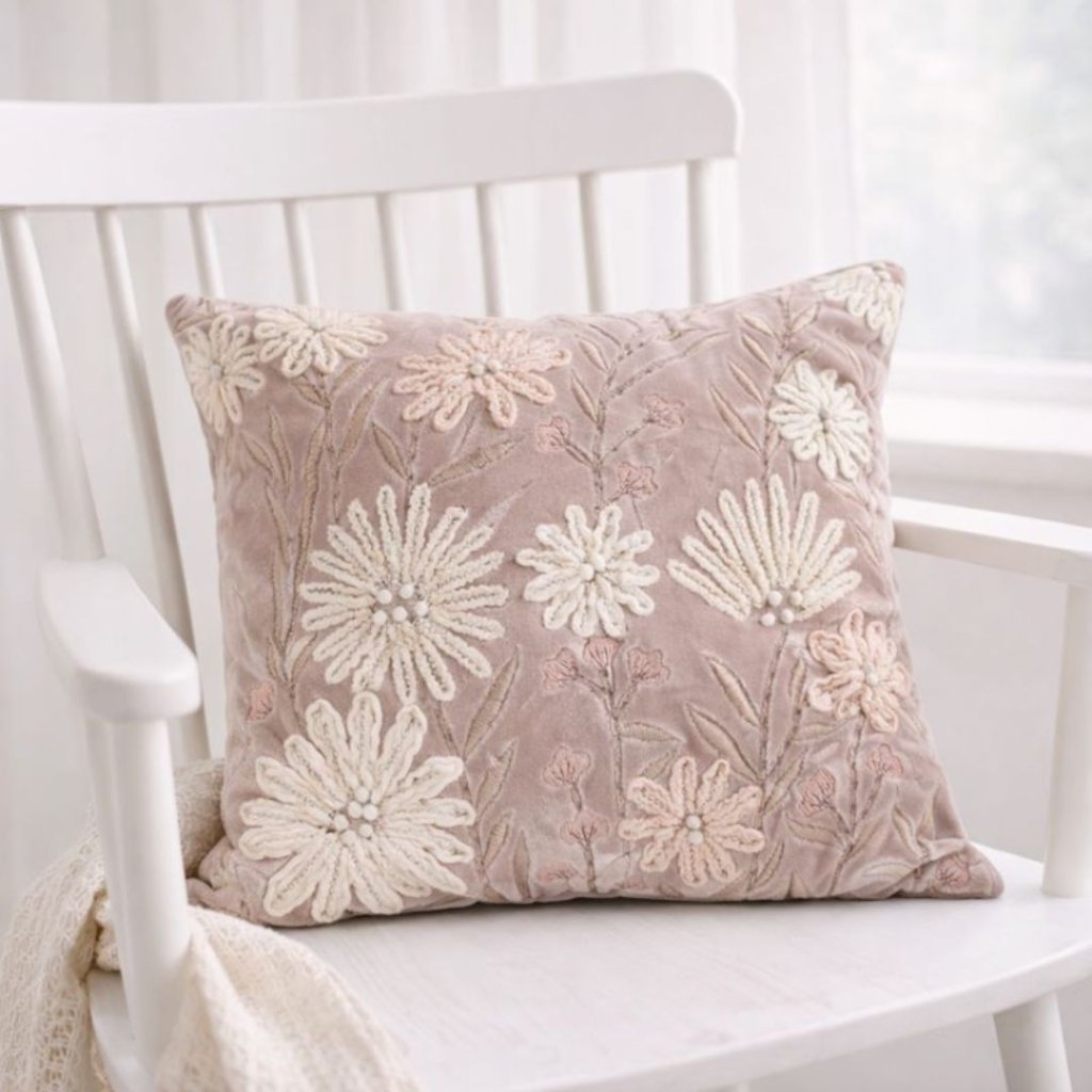 - Polštář vyšívaný Pink Flower je jako něžná jarní louka ukrytá v látce. Ručně tkané roztomilé květiny mu dodávají jedinečný kouzelný vzhled, jemné, hravé a zároveň elegantní.
