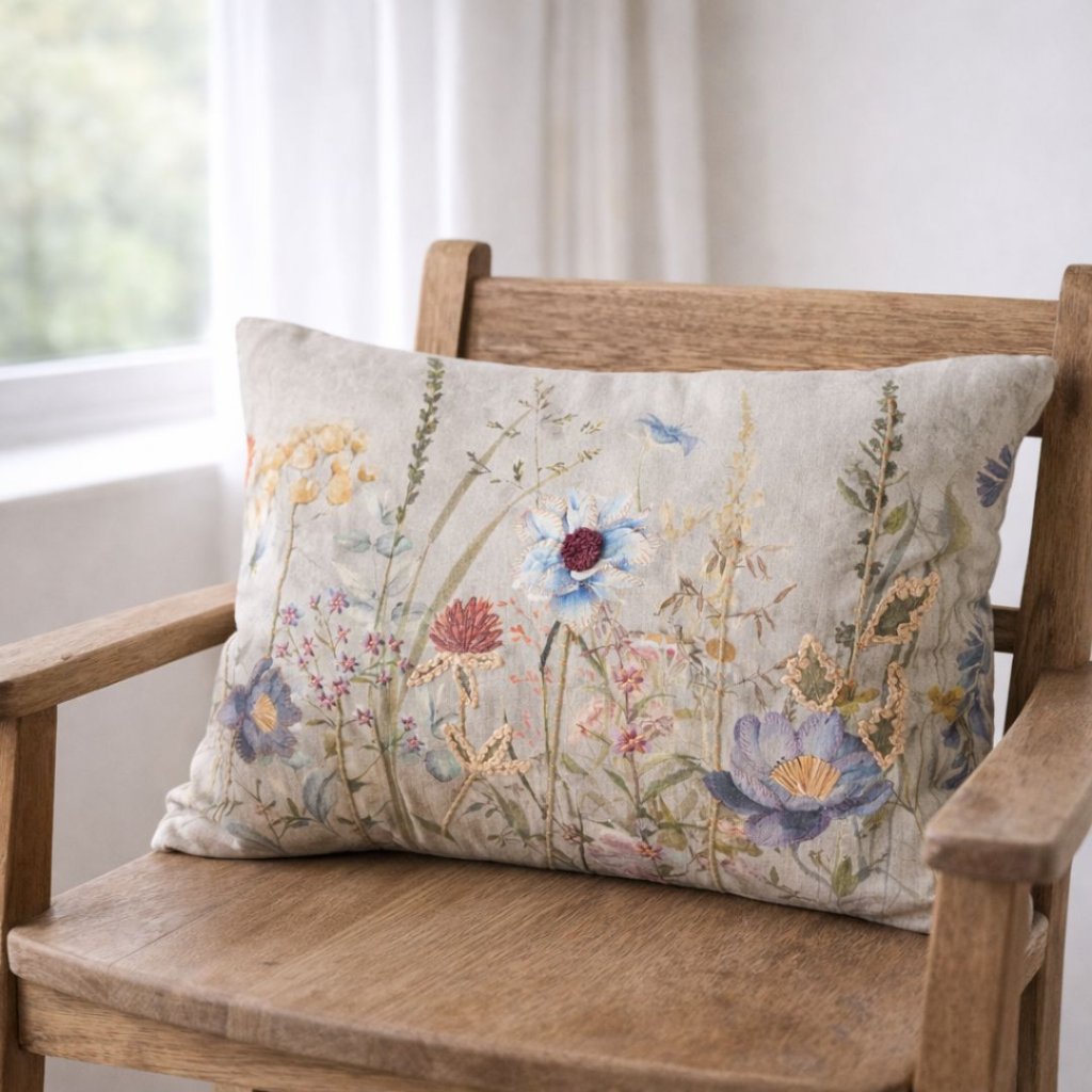 Jemný květinový motiv připomíná letní louku zalitou světlem a vnáší do interiéru lehkost i přirozenou eleganci. Polštář krásně doplní klidné posezení, kde se snoubí barvy přírody s pocitem domova. Ideální detail pro chvíle, kdy chcete zpomalit a jen být.
