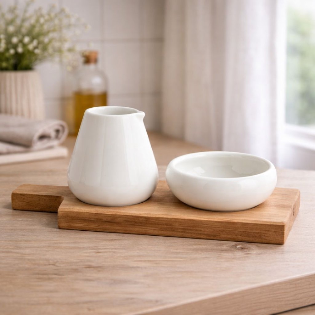 - Nádoby jsou vyrobeny z kvalitního porcelánu a prkénko z akátového dřeva. Na Vašem stole bude sada vypadat dokonale a pro ty z Vás kdo mají rádi bílou barvu v kombinaci se dřevem je perfektním a zároveň designovým doplňkem do Vaší kuchyně.