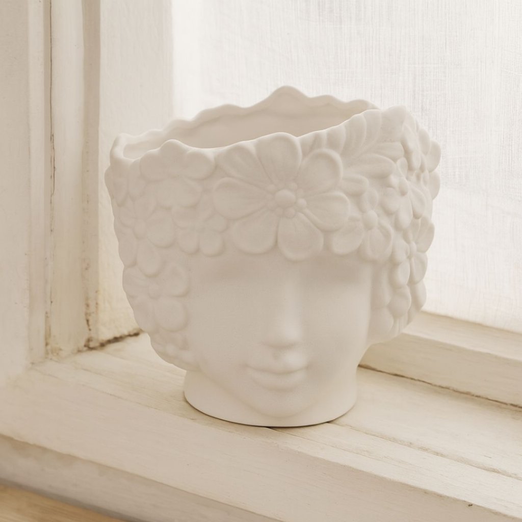 - Jemný a elegantní kousek, který promění každou rostlinku v malý umělecký objekt. Matně bílý povrch a reliéfní květinový věnec dodávají dekoraci romantický nádech a skvěle zapadnou do světlého, útulného interiéru.
