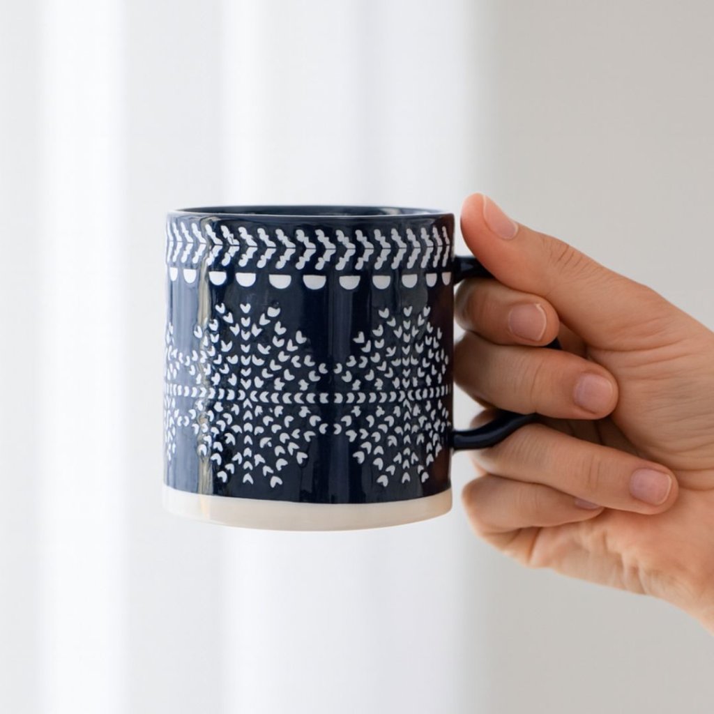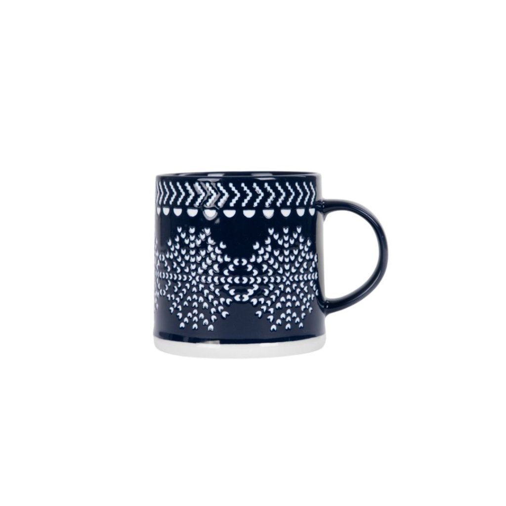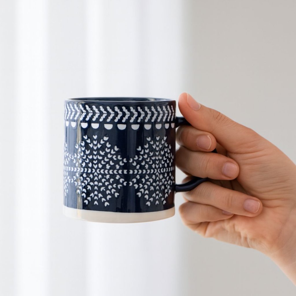 - Porcelánový hrnek v tmavě modré barvě s jemným bílým vzorem působí elegantně a nadčasově. Kontrast barev podtrhuje jeho jedinečný charakter a dodává mu špetku zimního kouzla. Díky objemu 0,55 l je ideální pro dlouhé chvíle s horkým čajem, voňavou kávou či čokoládou. Stylový doplněk pro klidná rána i večery v teple domova.