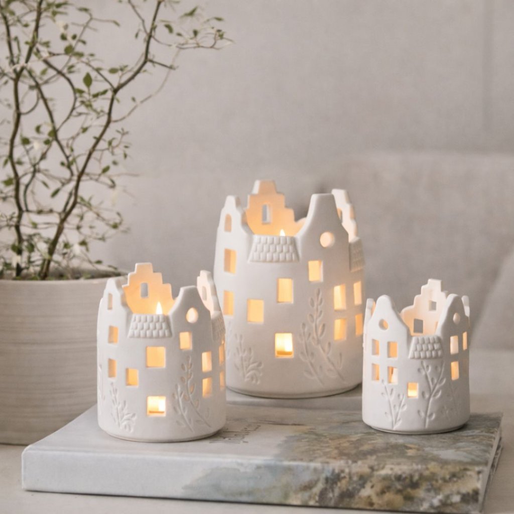 - Svícen ve tvaru malebných domečků s jemnými detaily reliéfu prosvítá po zapálení svíčky a přináší do vašeho domova kouzlo světla a stínů.