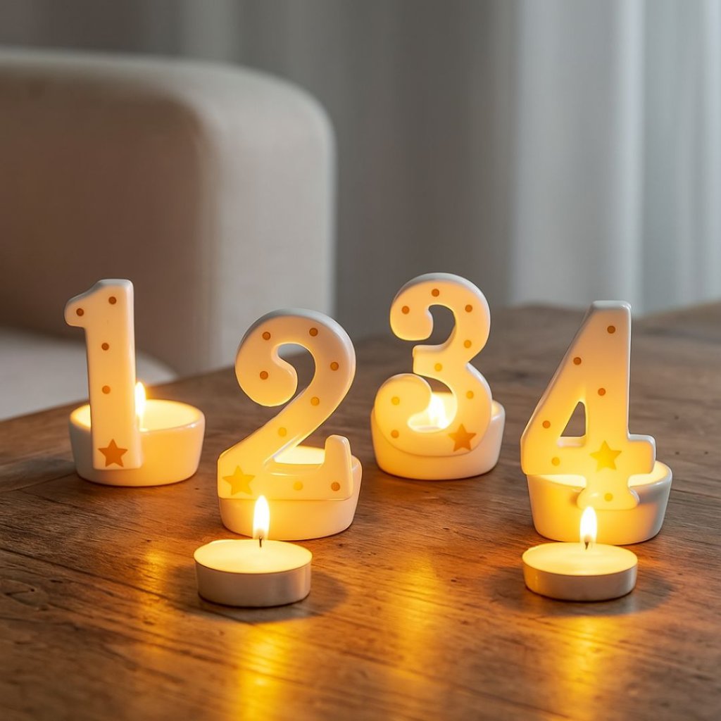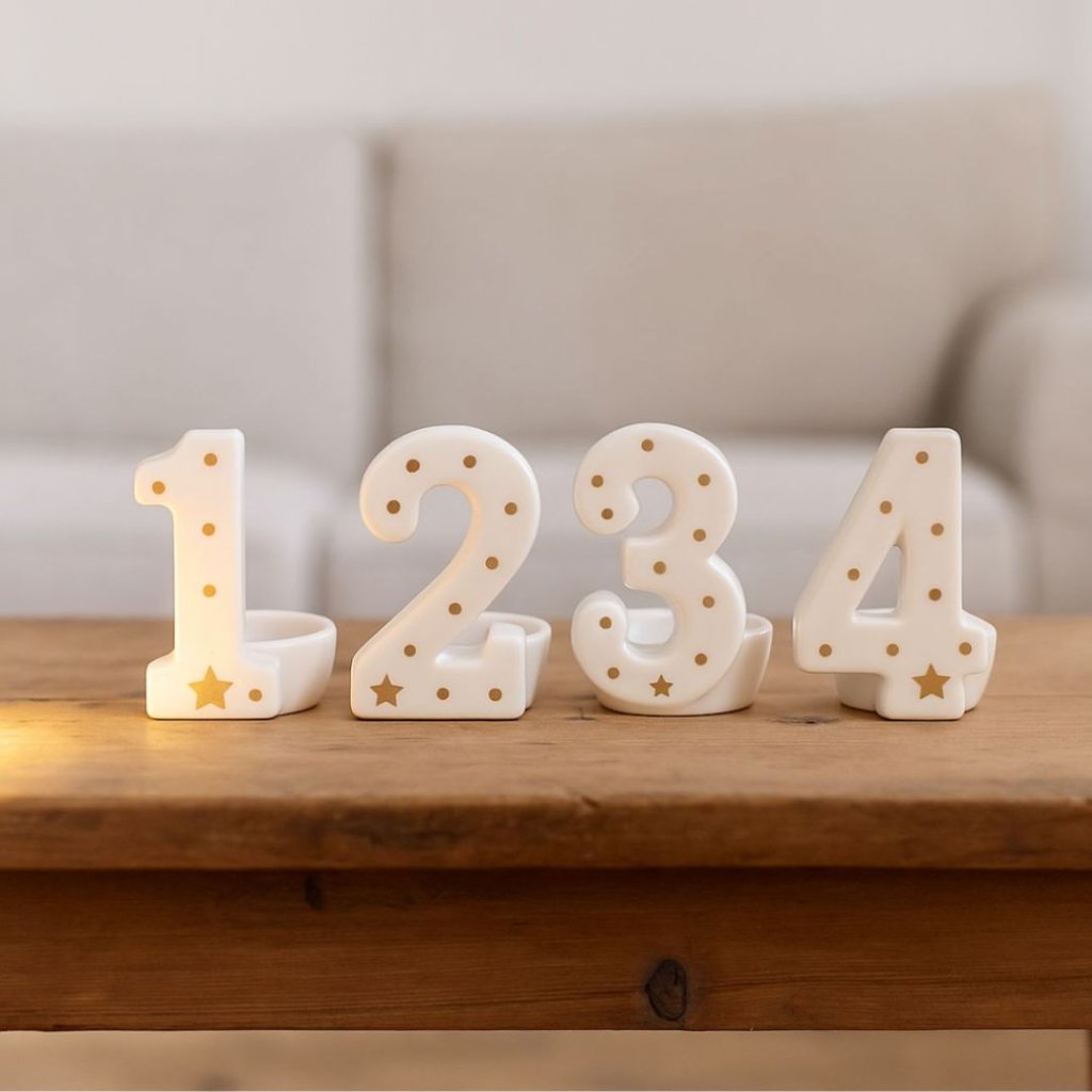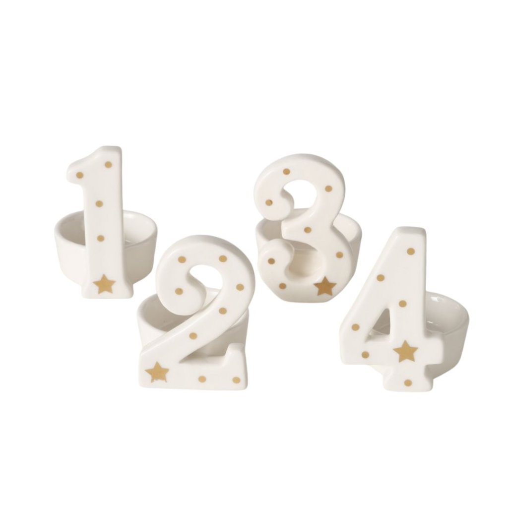 - Sada čtyř elegantních keramických svícnů ve tvaru čísel 1, 2, 3 a 4 s jemným zlatým dekorem hvězdiček a puntíků.