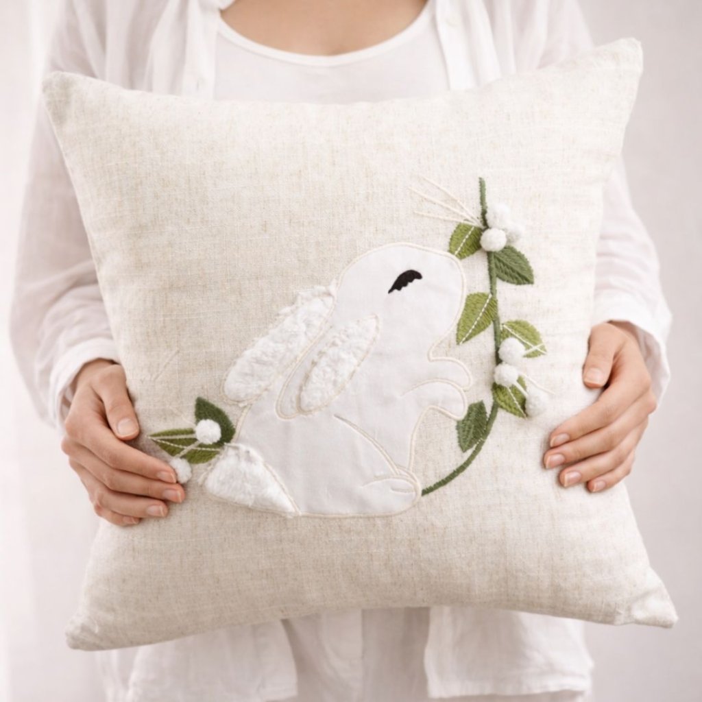 Len v jeho nejjemnější podobě. Aplikace zajíčka s plastickým detailem a drobnou bambulkou, která dodává celku lehkou hravost. Tula není jen sezónní dekorace – je to tichý detail, který zútulní prostor a přinese do něj světlo, klid a dotek jara.