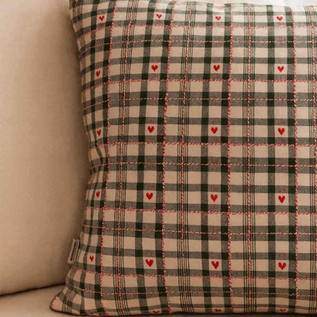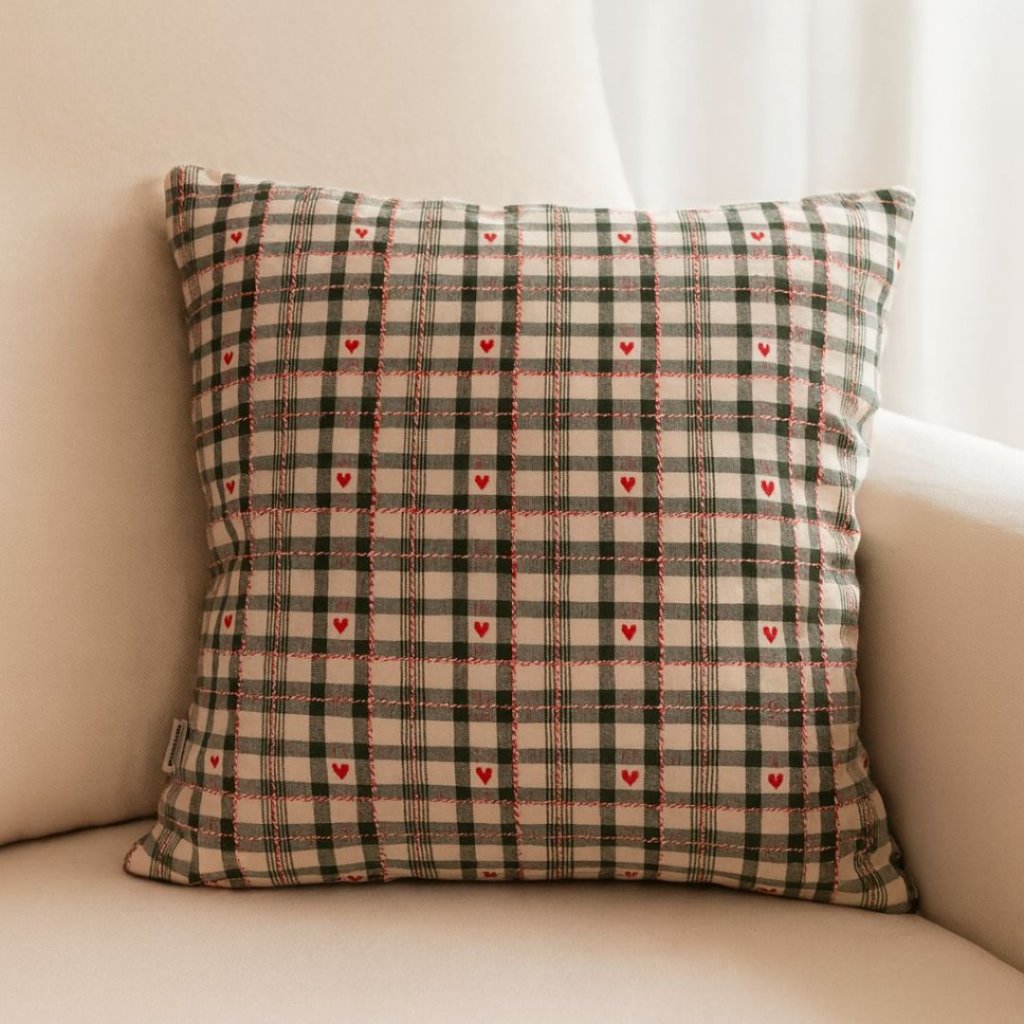 - Klasický kostkovaný vzor v tónech krémové, zelené a červené je ozvláštněn drobnými srdíčky, která dodávají celku útulný a hravý nádech.