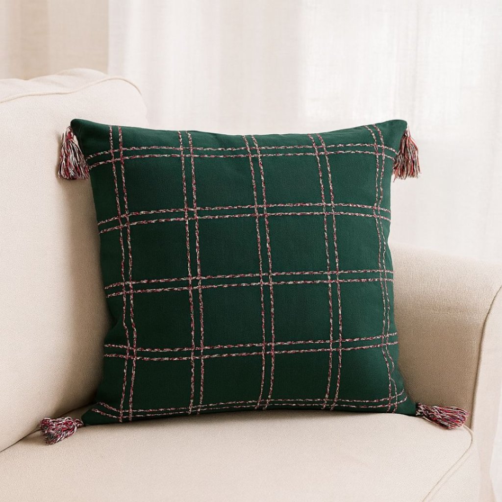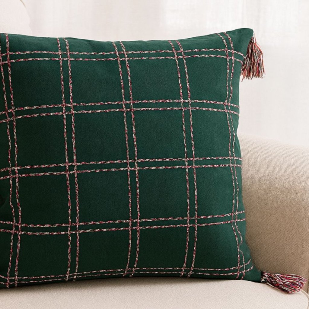 - Tento tmavě zelený povlak na polštář s jemnou kostkovanou výšivkou v červených a béžových tónech je doplněn o čtyři vícebarevné třásně, které mu dodávají hravý, ale přirozený vzhled.