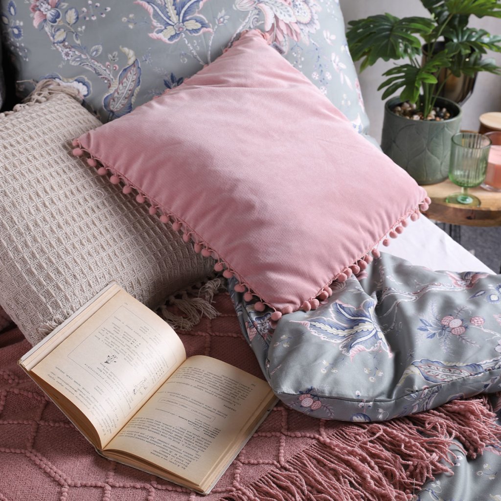 - Čtvercový růžový povlak na polštář ESLOV potěší svým vzhledem. Zvýrazní jak pokoj zařízený v klasickém, tak i inovativním stylu. Hladká textura povlaku na polštář s okraji zdobenými bambulkami je jemnou směsicí tradice a moderny.