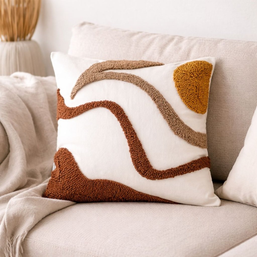 - Dekorační povlak na polštář Nayla vyniká moderním abstraktním motivem v přírodních tónech, který skvěle doplní minimalistický i skandinávsky laděný interiér.