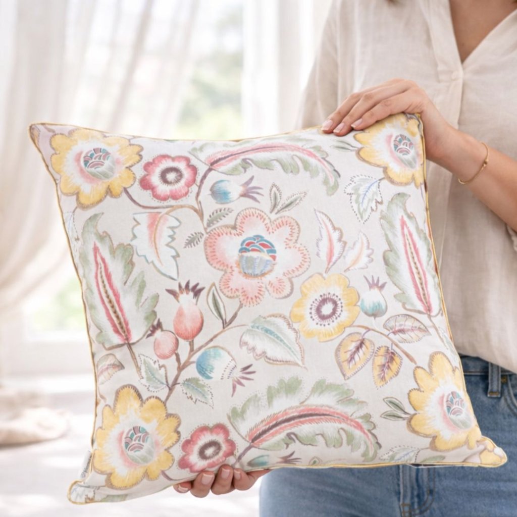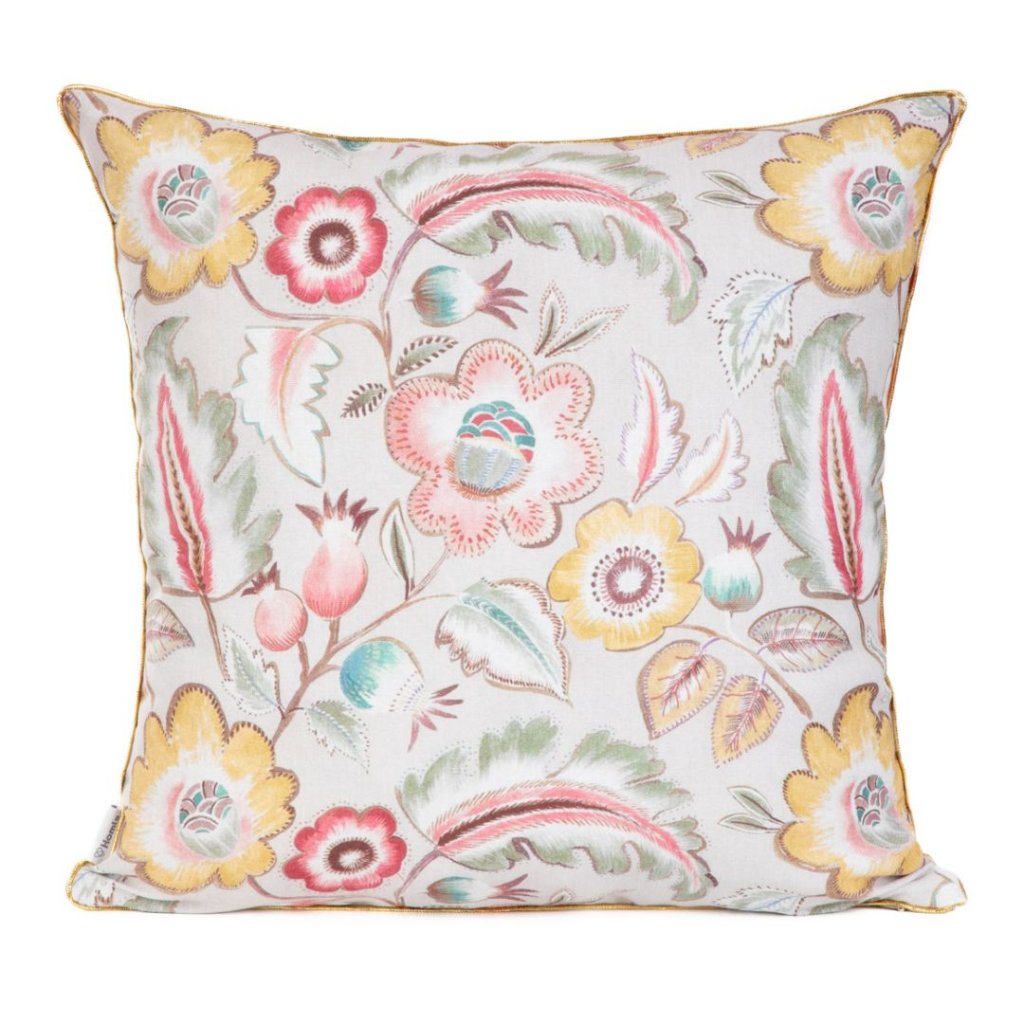 - Jemná hra barev, která rozzáří interiér bez zbytečné okázalosti. Květinový vzor v teplých tónech působí lehce romanticky, zatímco decentní zlaté lemování dodává polštáři upravený, sofistikovaný detail.
