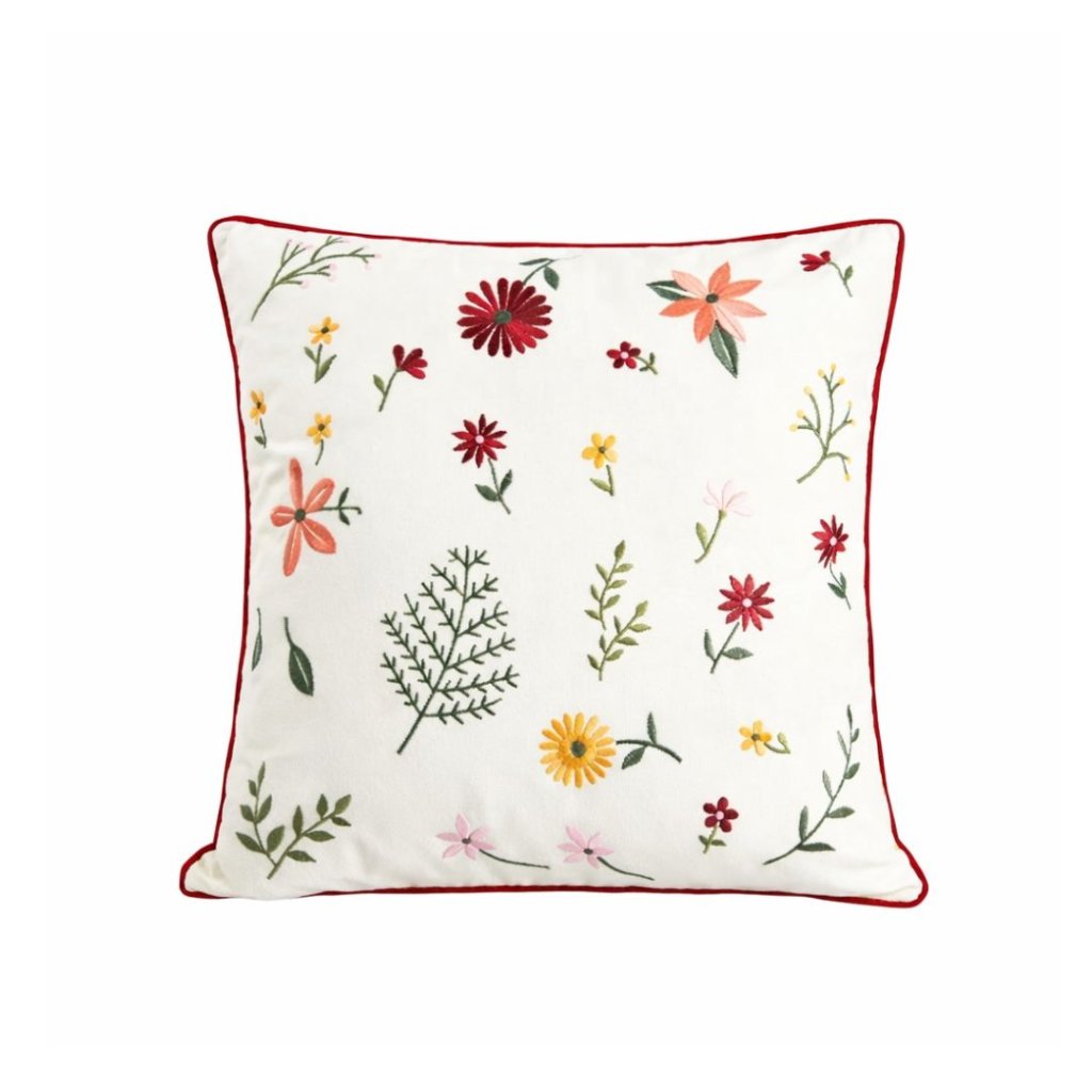 Malý detail, který dokáže změnit atmosféru celého prostoru. Krémový podklad s něžnou výšivkou lučních květů a decentním červeným lemem působí lehce, klidně a domácky – přesně tak, jak má domov působit. Ideální do světlých interiérů, na křeslo, postel i pohovku. -