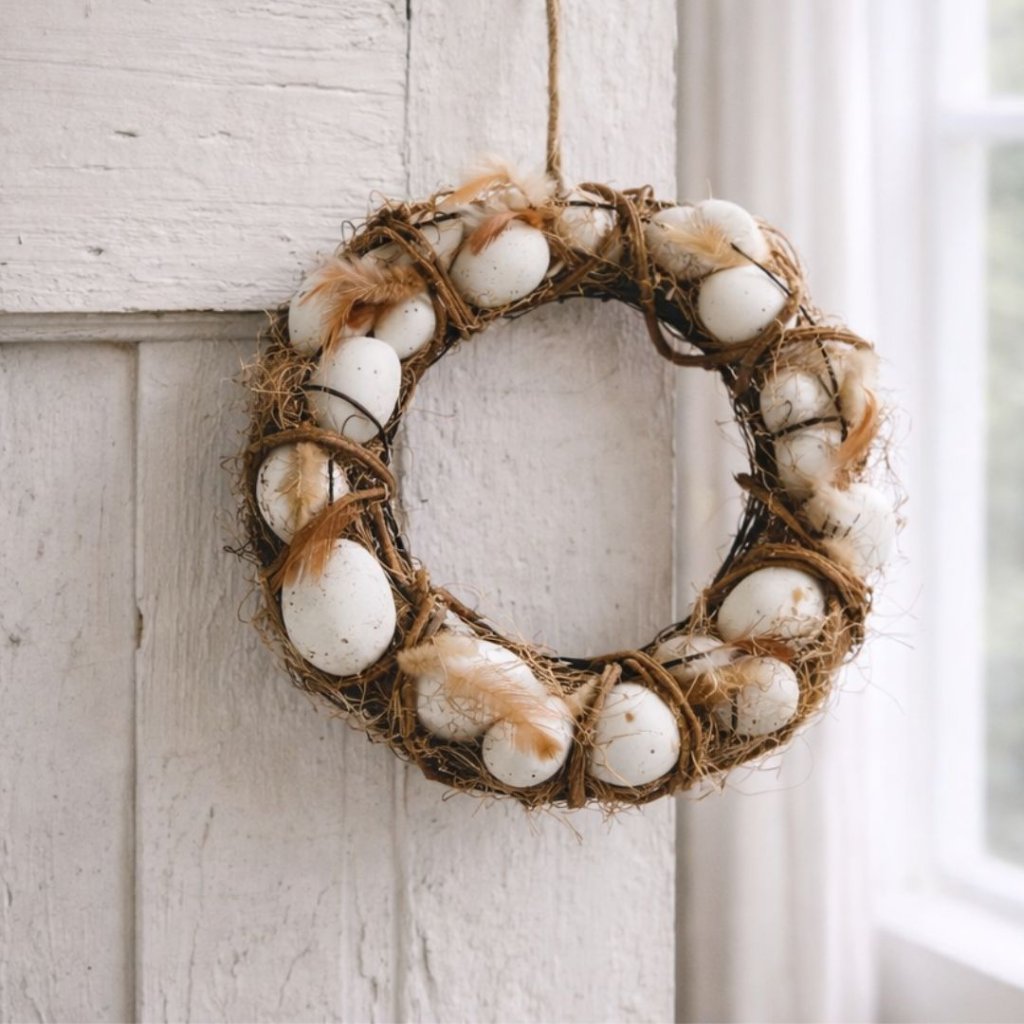 - Velikonoční přírodní věnec s bílými vajíčky je jemná a elegantní dekorace, která dodá vašemu domovu svěží jarní atmosféru.