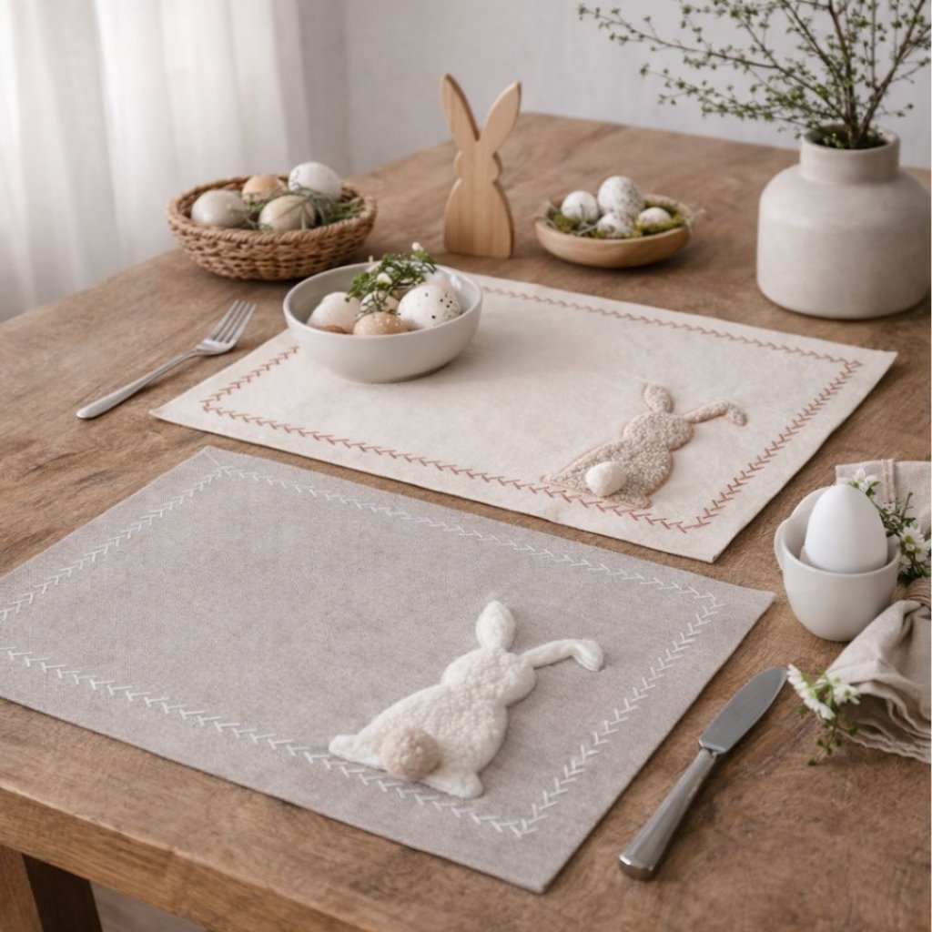 - Jemný detail, který udělá z obyčejného stolování malý rituál. Látkové prostírání se zajíčkem působí klidně, hřejivě a přirozeně – přesně tak, jak to máme u deejady rádi. Vyšívaný okraj a drobný plastický motiv zajíčka dodají stolu osobitost bez zbytečné okázalosti. Krásné na Velikonoce, ale tak jemné, že zůstane klidně po celý rok.