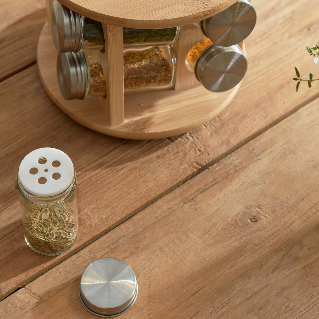 - Malé otvory ve středu konstrukce byly vytvořeny pro umístění skleněných nádob pokrytých kovovými víčky. Tyto nádoby byly vytvořeny, aby chránily naše koření před vlhkostí , které zůstane déle čerstvé.