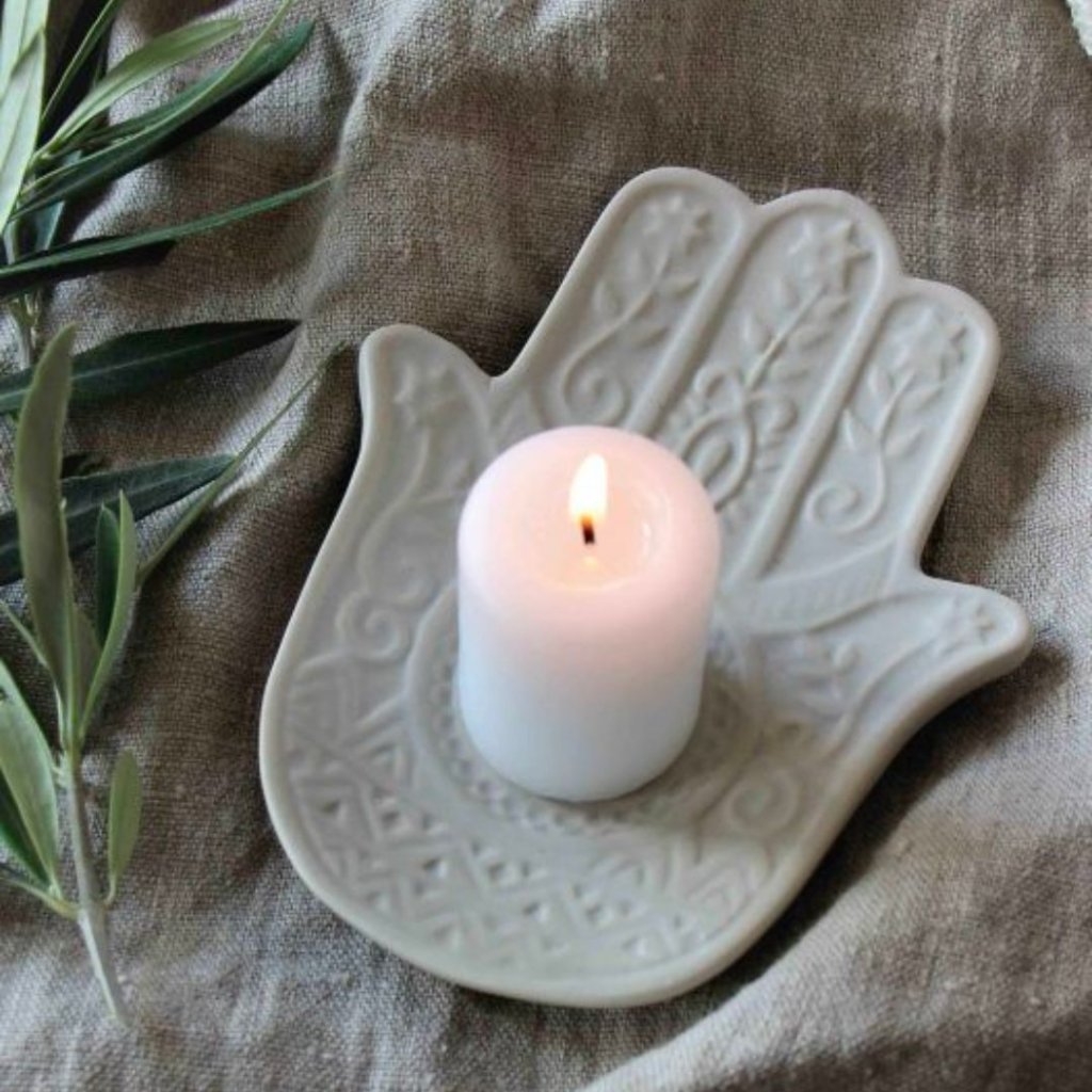 Hamsa ruka jako krásný svícen, nebo lze použít na dobroty, třeba i na šperky, využití najde dle vaší fantazie a potřeb. Povrch je matný v jemné béžové barvě. Hlavním významem tohoto symbolu je ženskost, svou majitelku má chránit před nebezpečím, představuje také požehnání, moc a sílu.