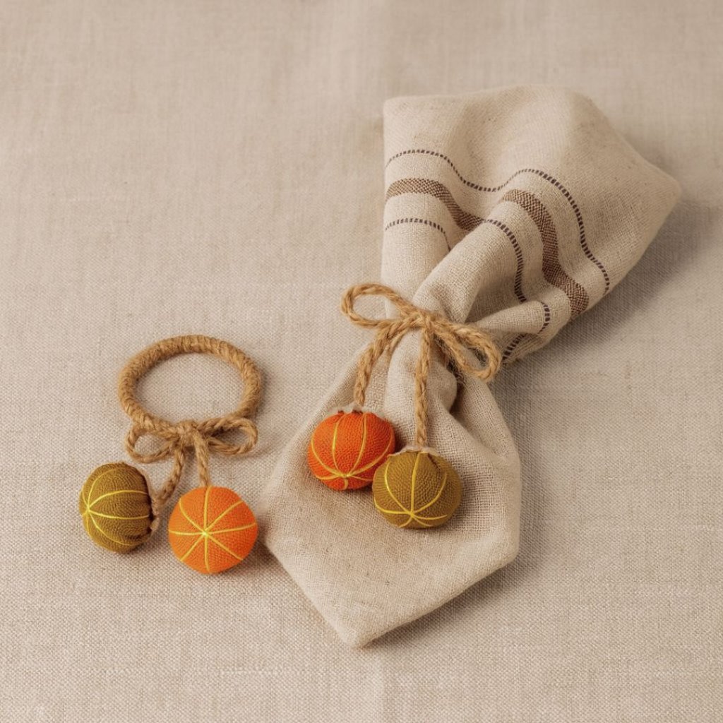 - Kroužky jsou ručně vyrobené z pevného provázku a zdobené měkoučkými látkovými dýněmi, které působí jemně a přitom originálně. Ideální pro podzimní večeře, sváteční tabuli nebo jen tak – když chcete svému stolování dodat šmrnc. 🍂🎃