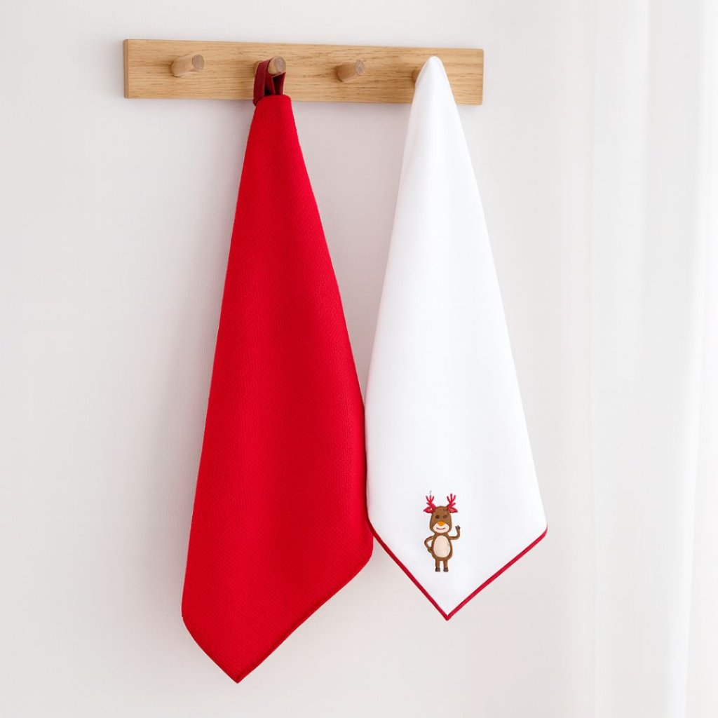 - ✨ Sada kuchyňských utěrek v červené a bílé barvě s lemováním a sobíkem – 45x65 cm