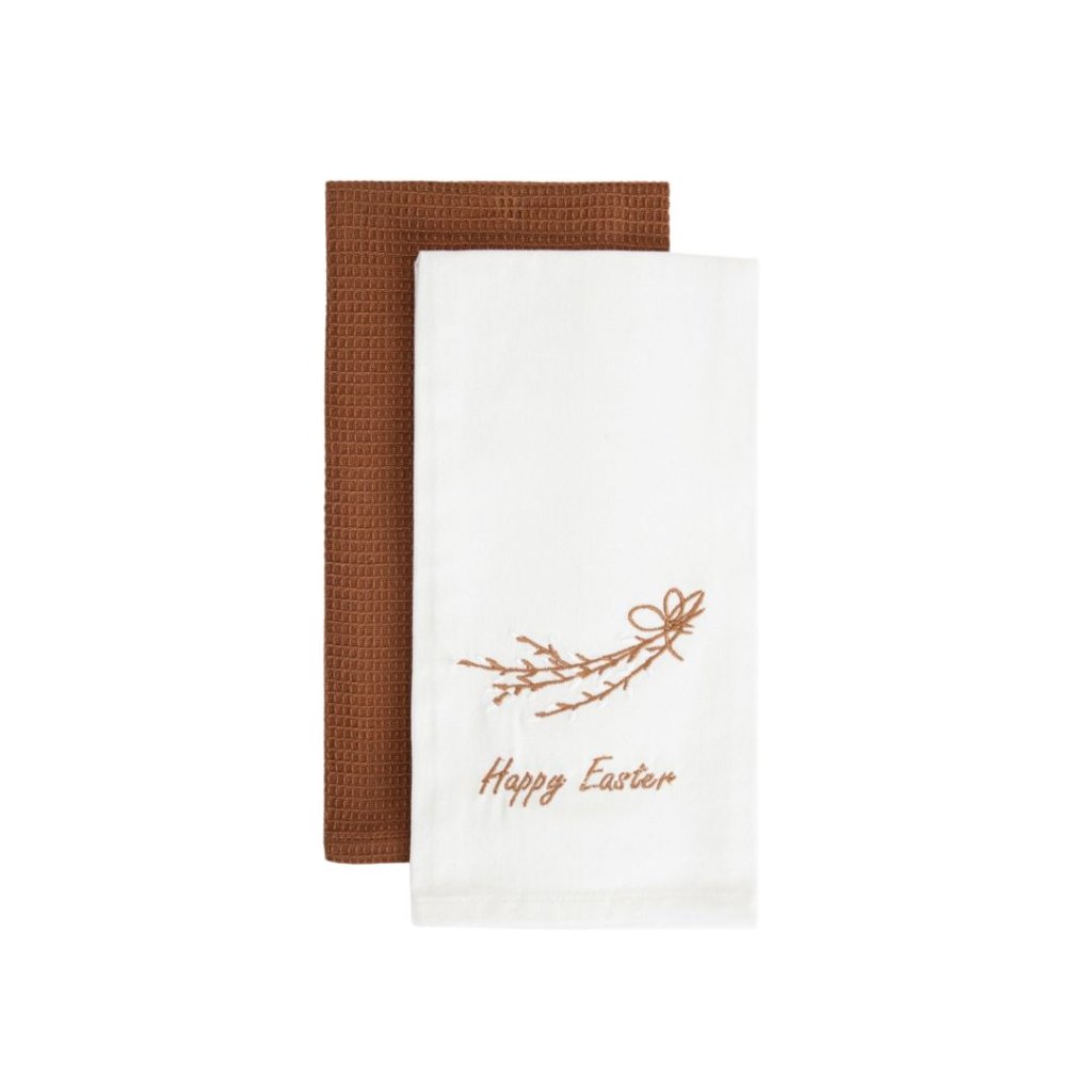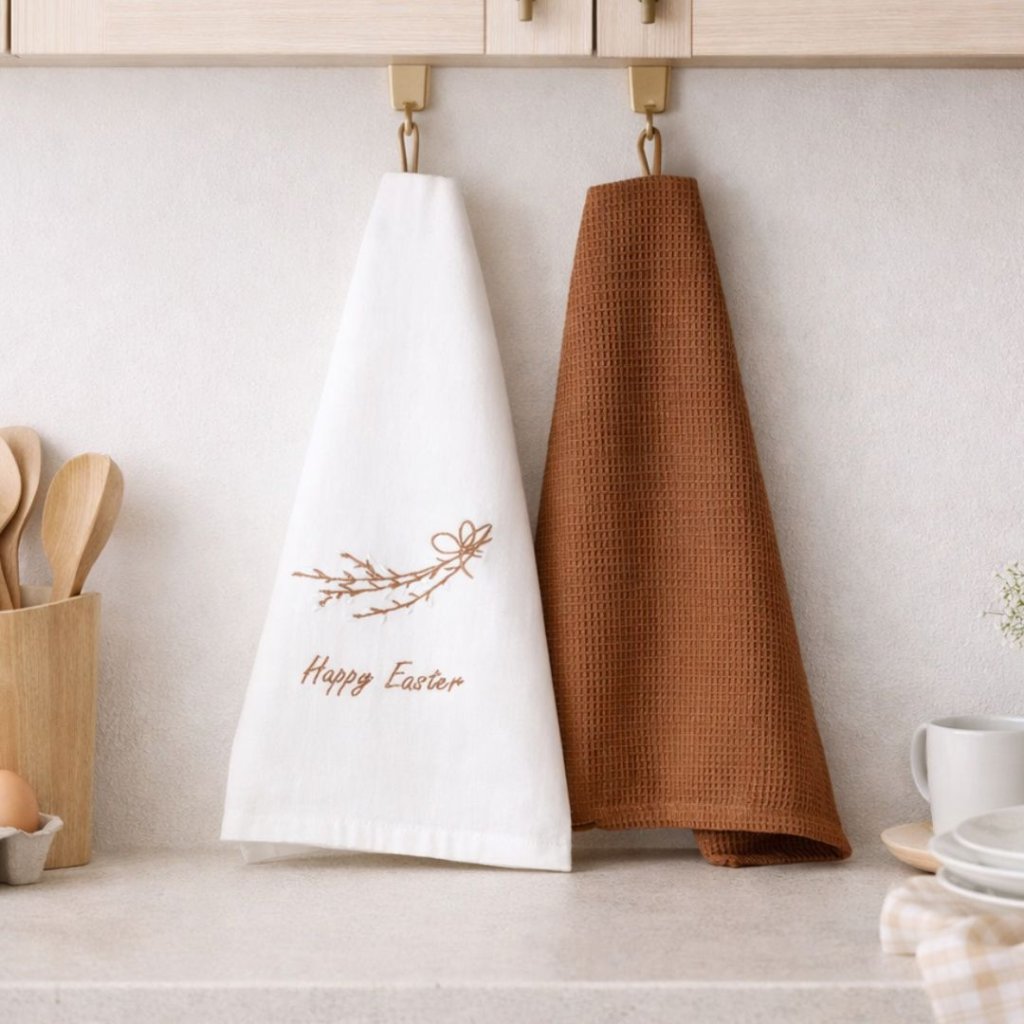 Sada kuchyňských utěrek v přírodním stylu. Jedna utěrka je zdobená jemnou výšivkou, druhá má praktický vaflový vzor pro lepší savost. Skvěle doplní světlou, minimalistickou kuchyni.