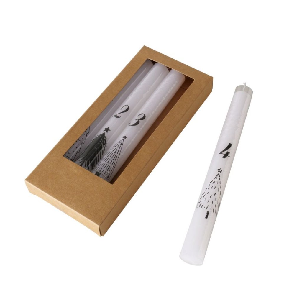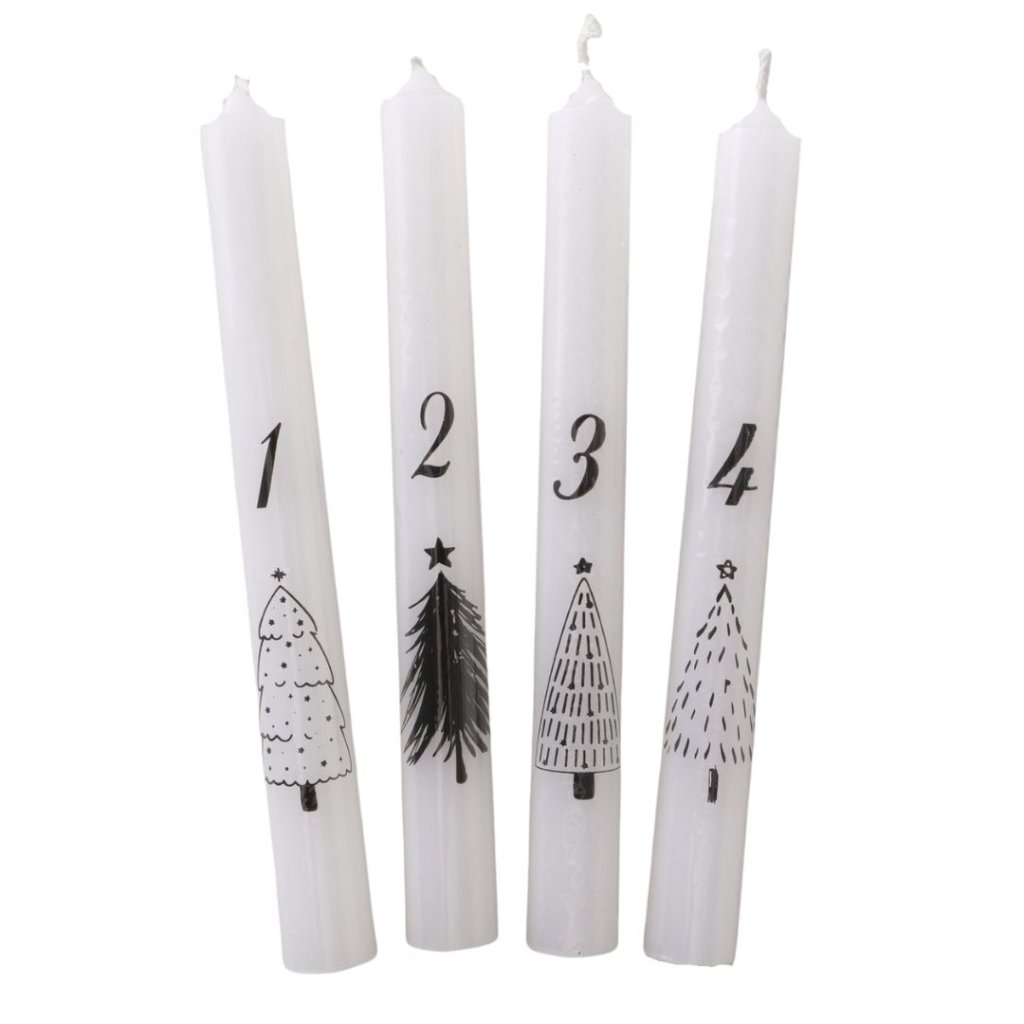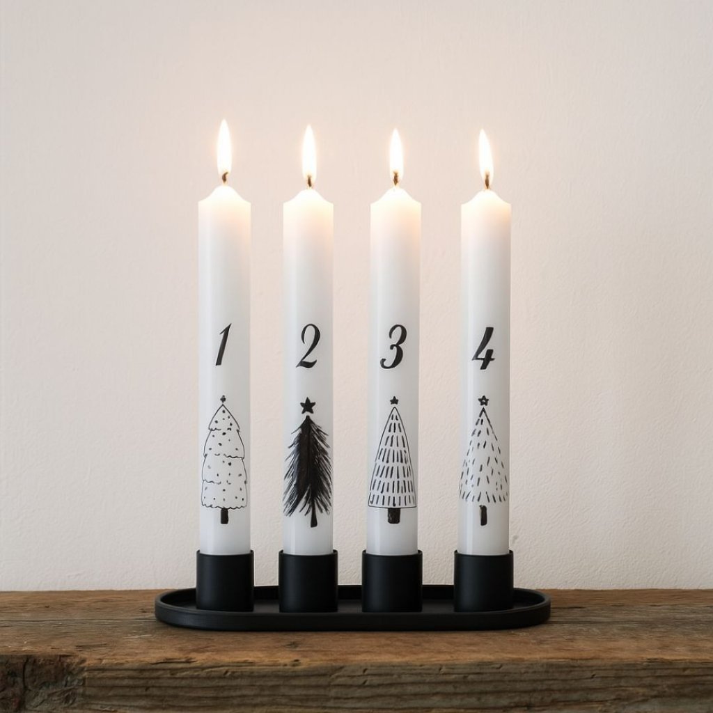 - Stylová sada čtyř vánočních svíček s černým minimalistickým potiskem stromků a čísel 1–4 je ideální volbou pro adventní období.