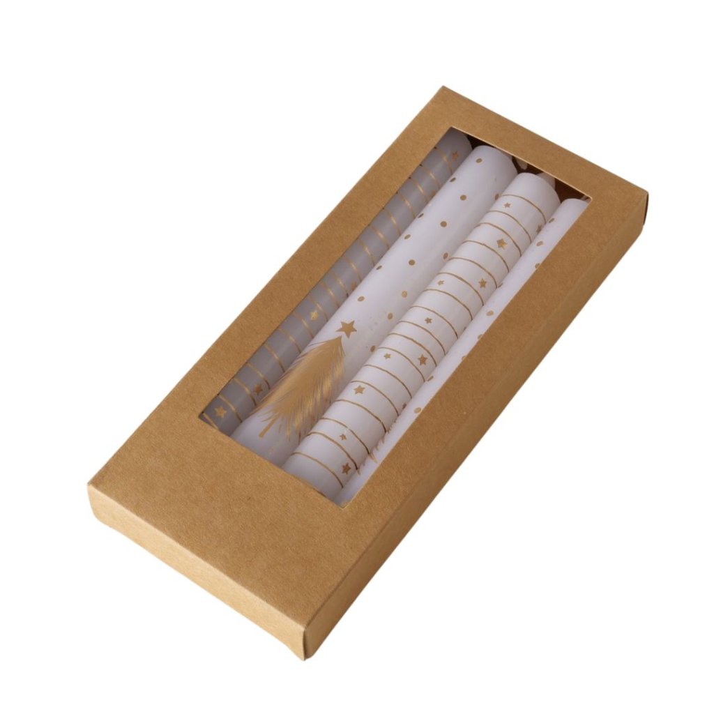 - Každá svíčka je vysoká 20 cm a zdobena decentním vánočním motivem – stromečky, hvězdičky a puntíky v matně zlaté barvě.