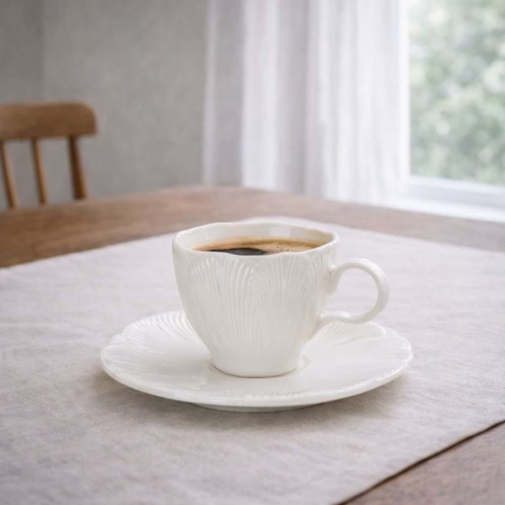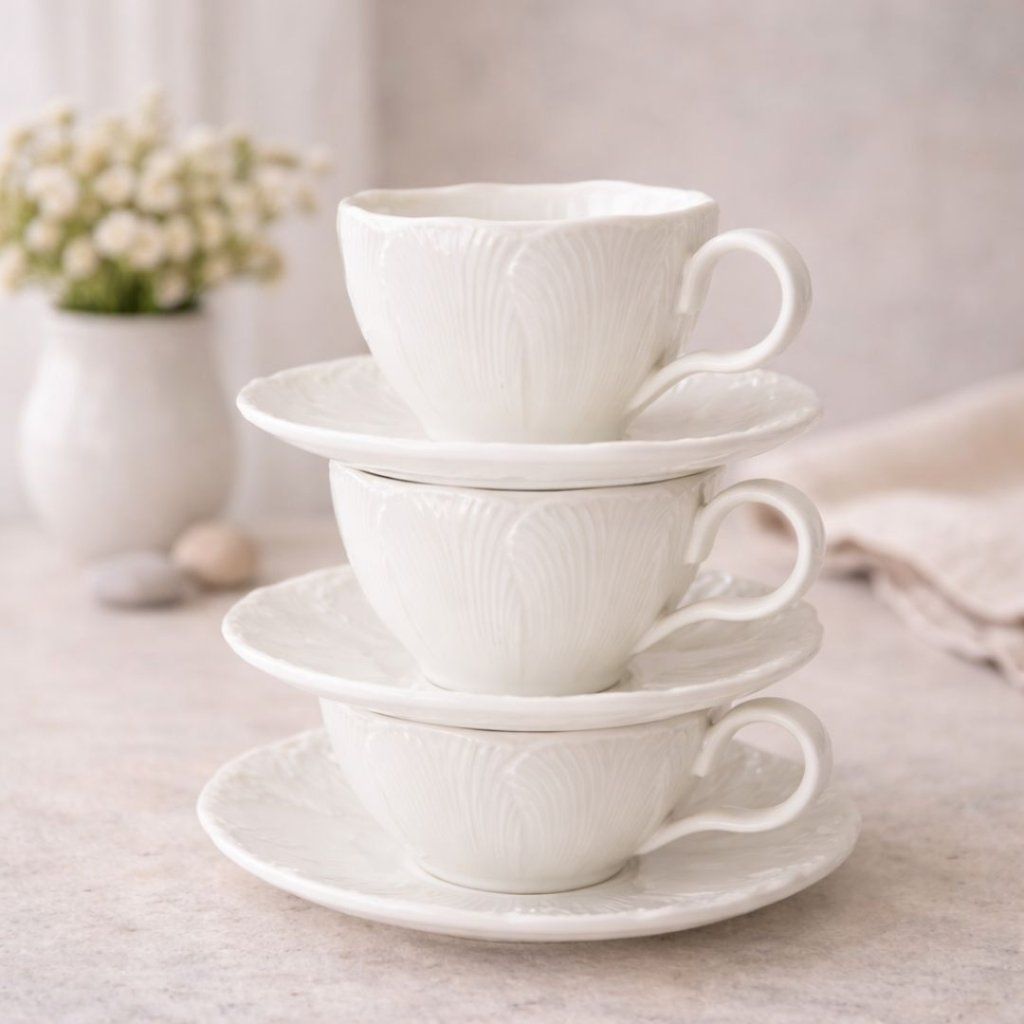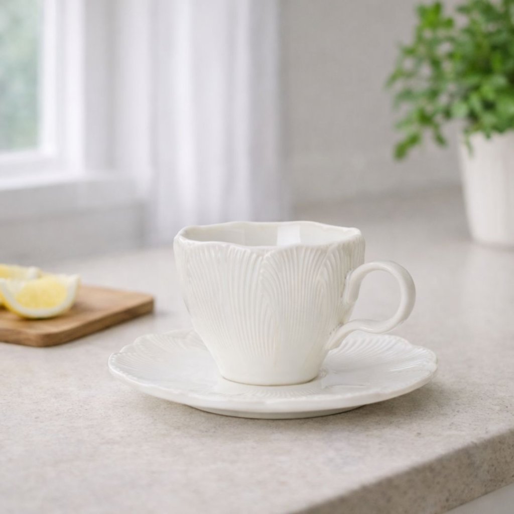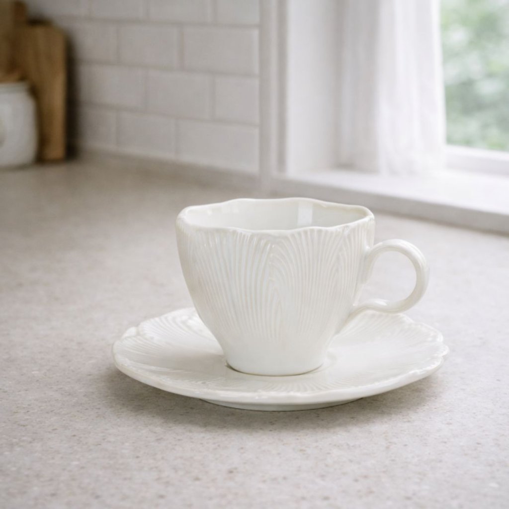 - Jemný šálek inspirovaný přírodou. Reliéfní vzor, zvlněný okraj a čistá bílá vytvářejí klidný, nadčasový celek.
