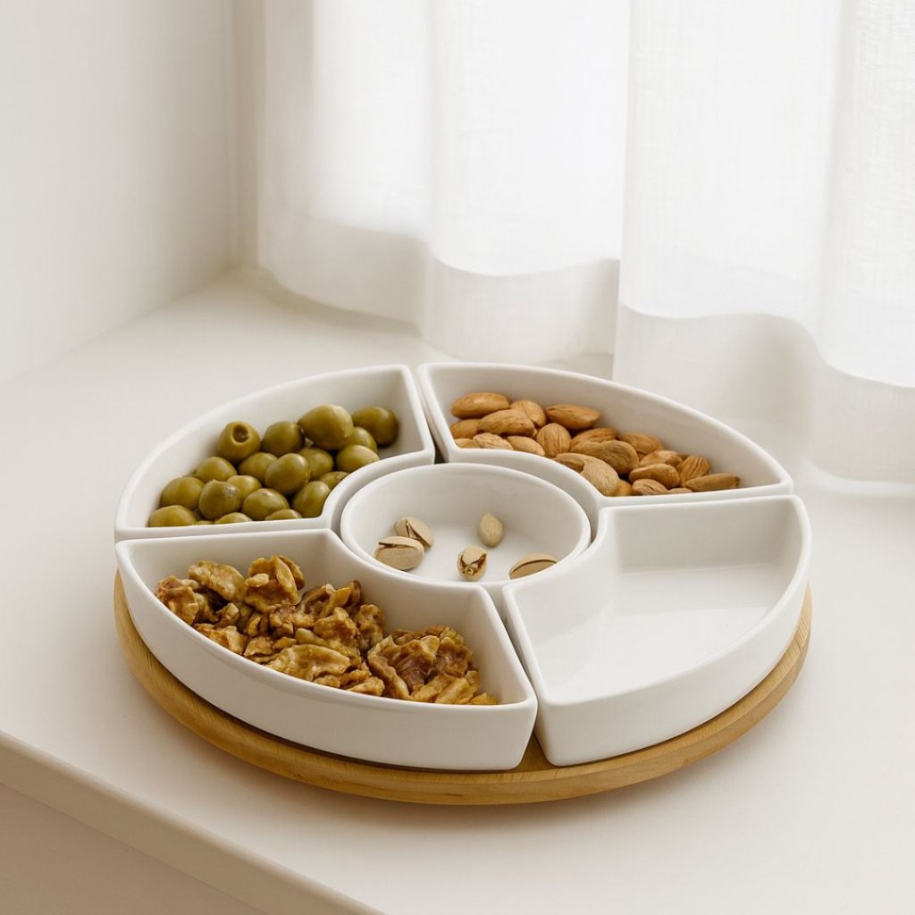 - Skládá se z více oddělitelných sekcí, které umožňují pohodlné servírování různých pochutin najednou.