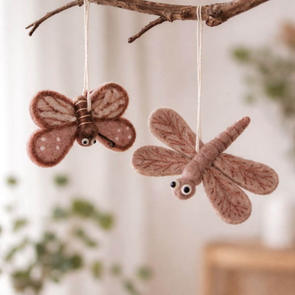 - Set dvou ručně vyráběných plstěných ozdob ve tvaru motýlka a vážky přinese do vašeho domova lehkost a útulnou atmosféru.