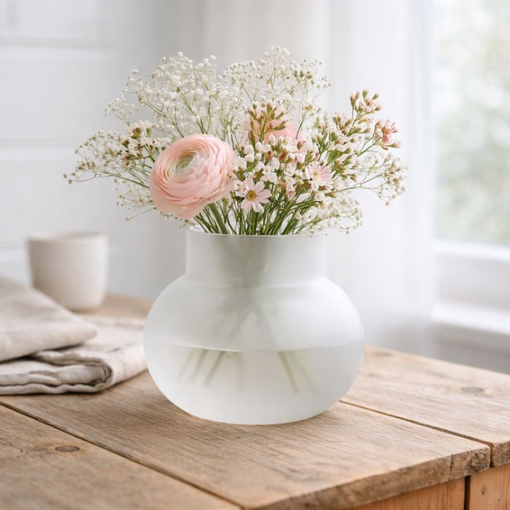 - Tichá, měkká, přirozená. Matné sklo rozptyluje světlo a dává květinám prostor vyniknout bez okázalosti. Stačí jeden stonek – a místnost se zpomalí.