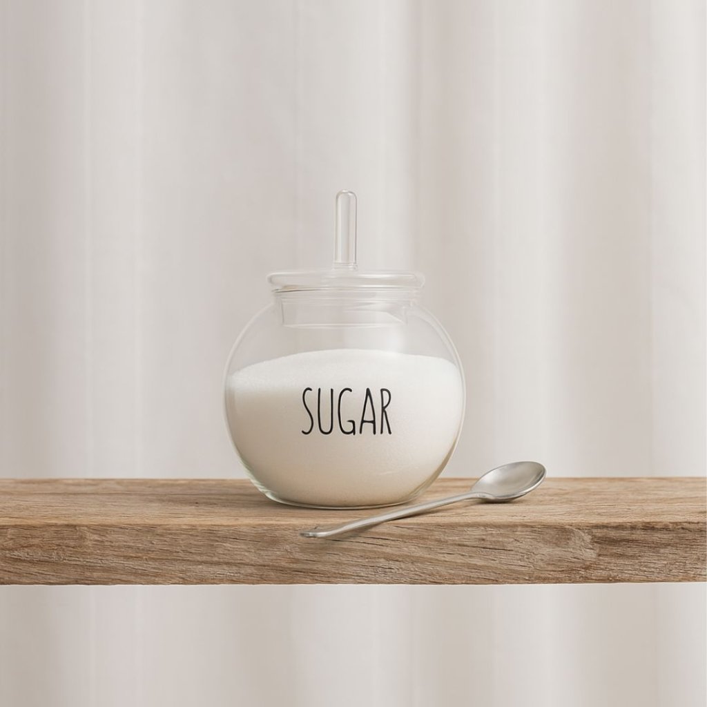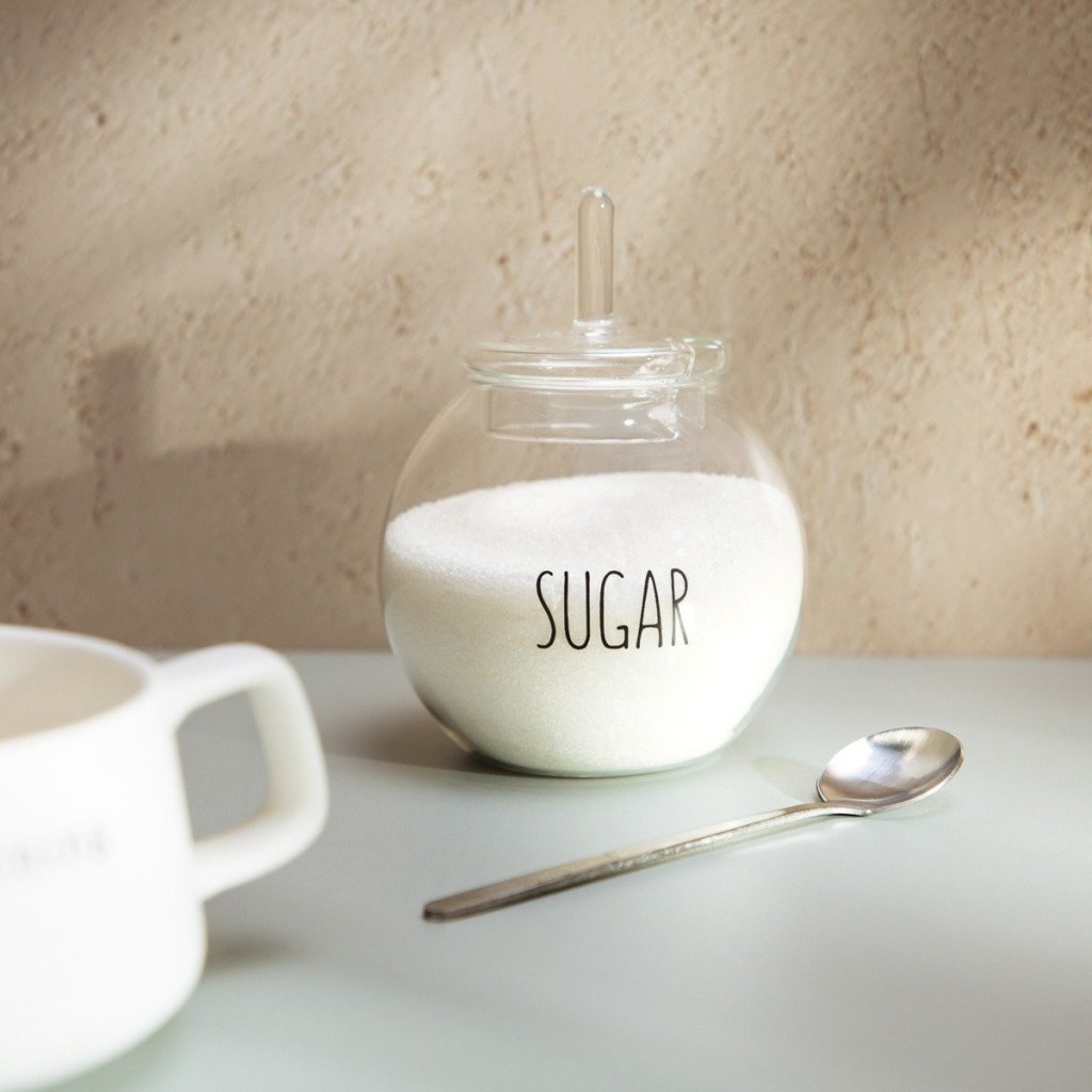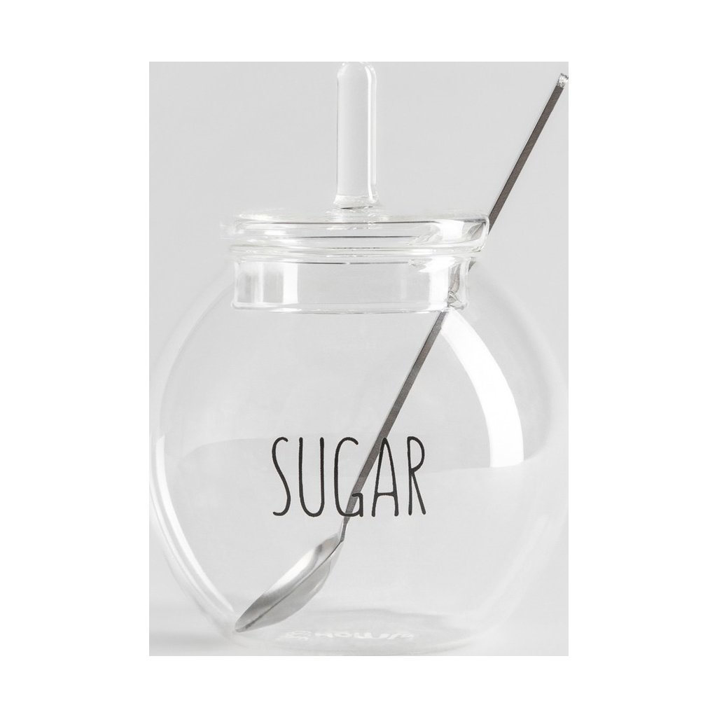 - Jednoduchý tvar s lehkým, zaobleným tvarem, černý nápis „SUGAR“ v moderním stylu, sada obsahuje praktickou lžičku a víčko.