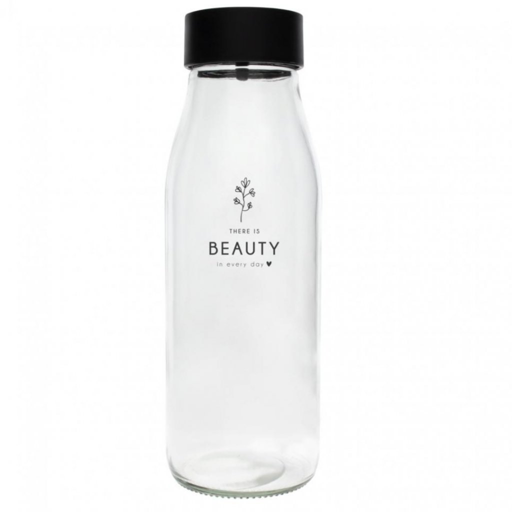 Skleněná karafa na vodu s černým víkem a černým nápisem od značky Bastion Collections. Vhodná na cesty a všední použití,aby jste měli tekutiny stále při sobě.